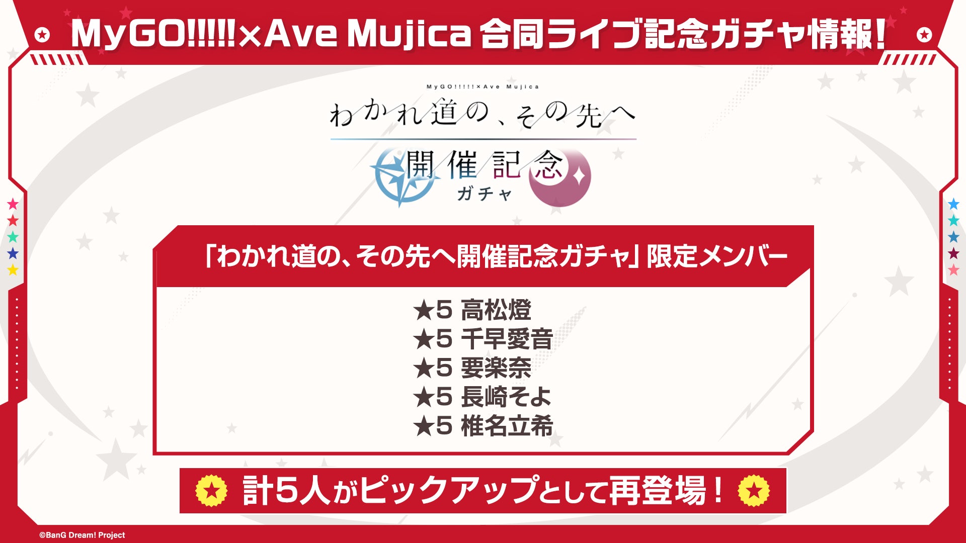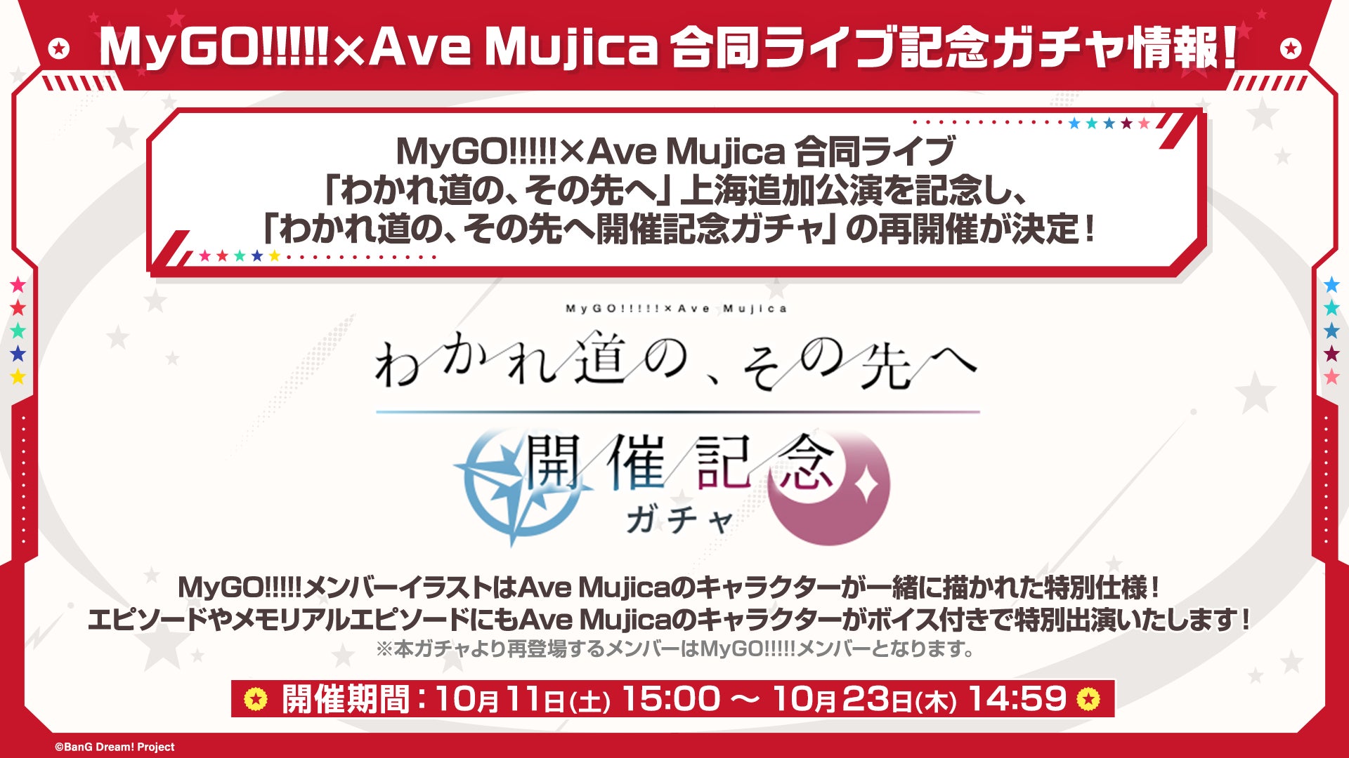 10月11日(土)15時よりMyGO!!!!!×Ave Mujica 合同ライブ「わかれ道の、その先へ」上海追加公演を記念して、「わかれ道の、その先へ開催記念ガチャ」の再開催が決定いたしました。