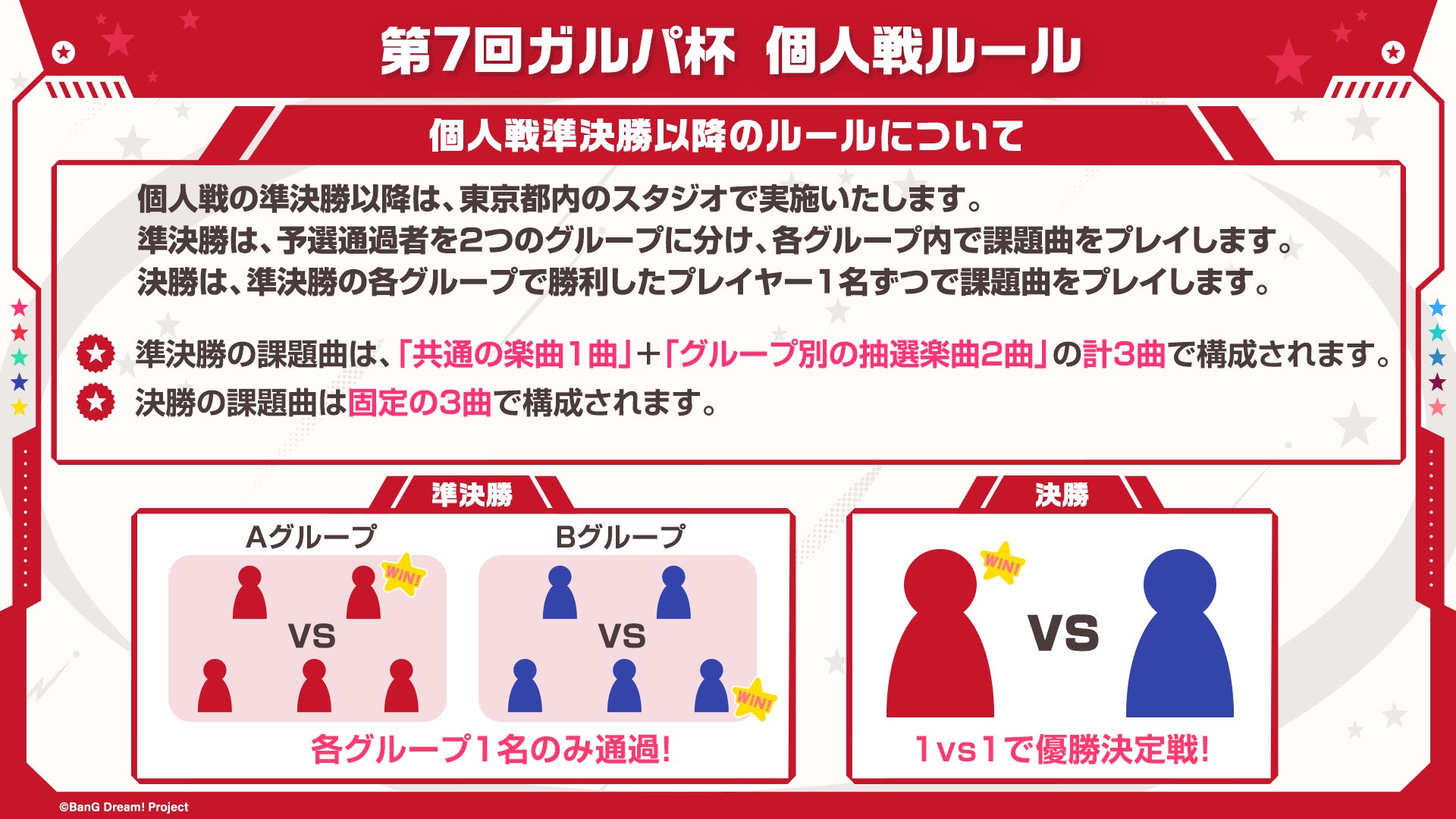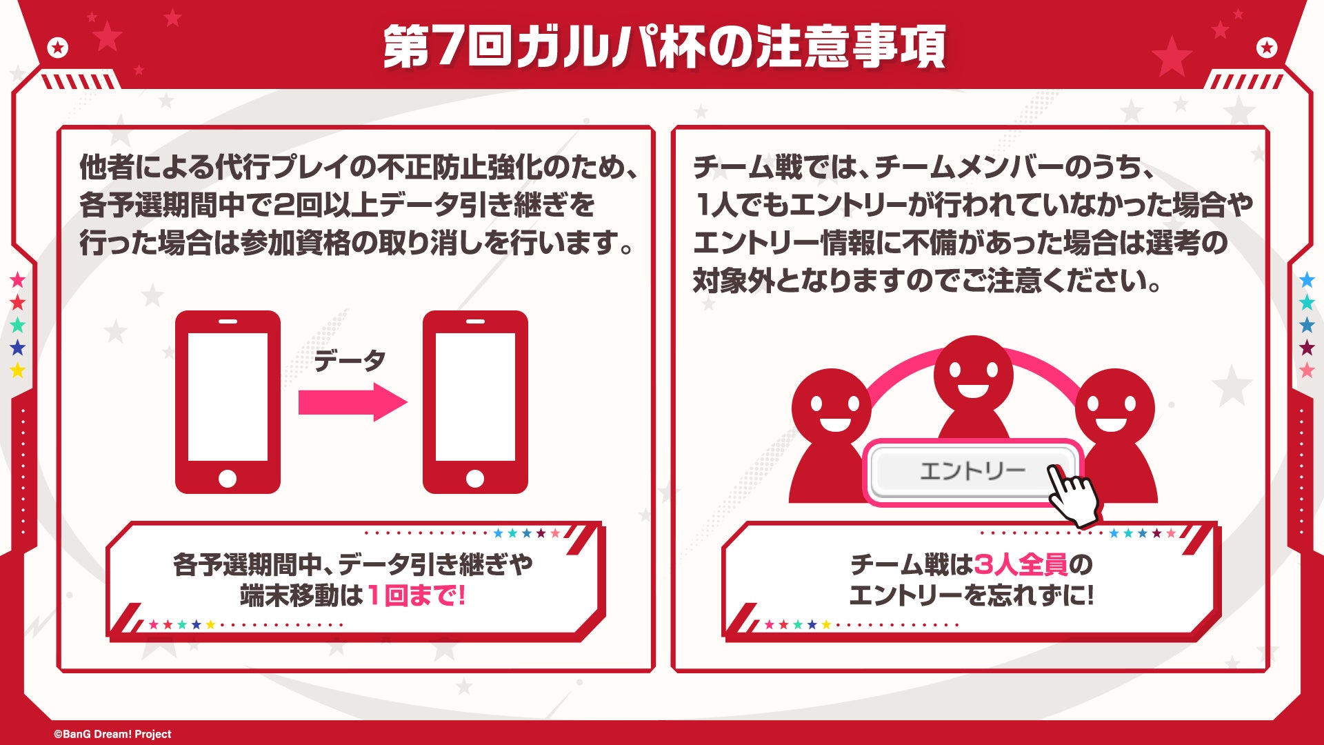 第7回ガルパ杯は、個人戦、チーム戦ともに1次予選は10月25日(土)12時から10月27日(月)11時59分まで、2次予選は2026年1月11日(日)12時から2026年1月13日(火)11時59分まで、それぞれアプリ内特設ページにてオンラインで開催いたします。