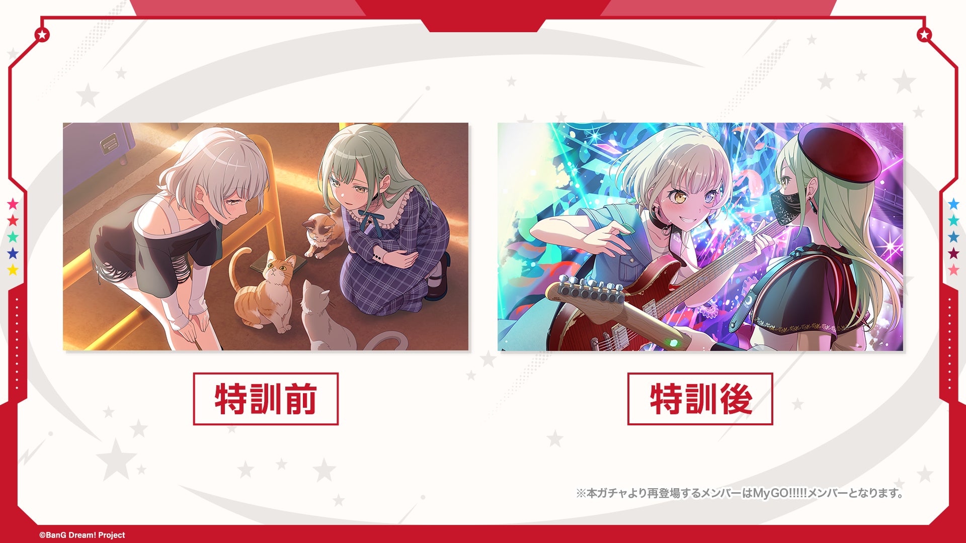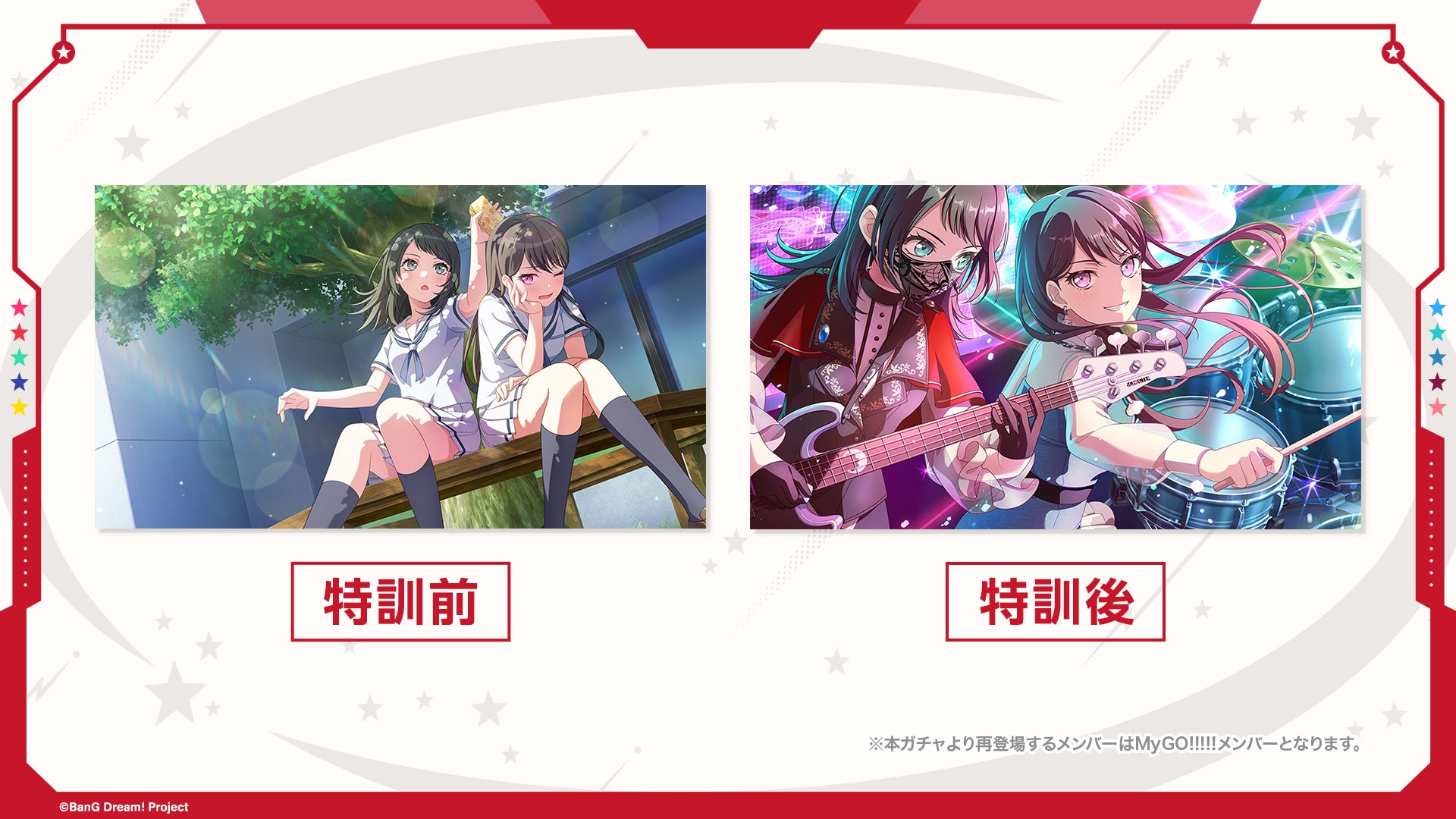 本ガチャで再登場するMyGO!!!!!メンバーのイラストは、Ave Mujicaのキャラクターが一緒に描かれた特別仕様となります。