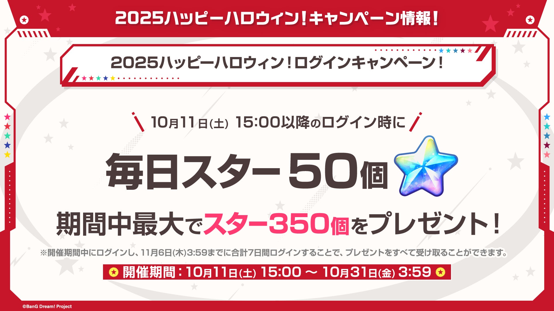 10月11日(土)15時以降にログインすることで、毎日「スター50個」が手に入り、7日間で最大「スター350個」をプレゼントいたします。