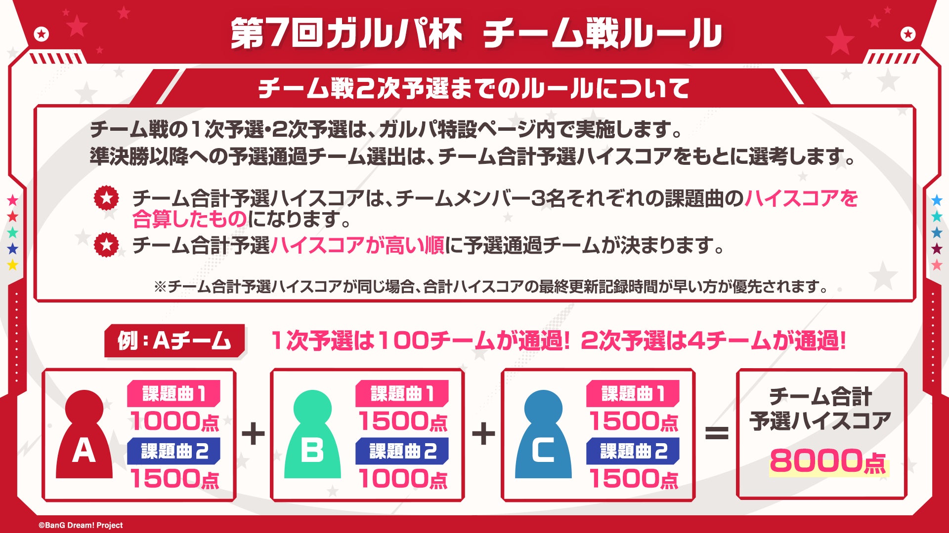 チーム戦の1次予選・2次予選は、ガルパ特設ページ内で実施し、チームメンバー全員の課題曲のハイスコアが高い順に予選通過者が決定いたします。