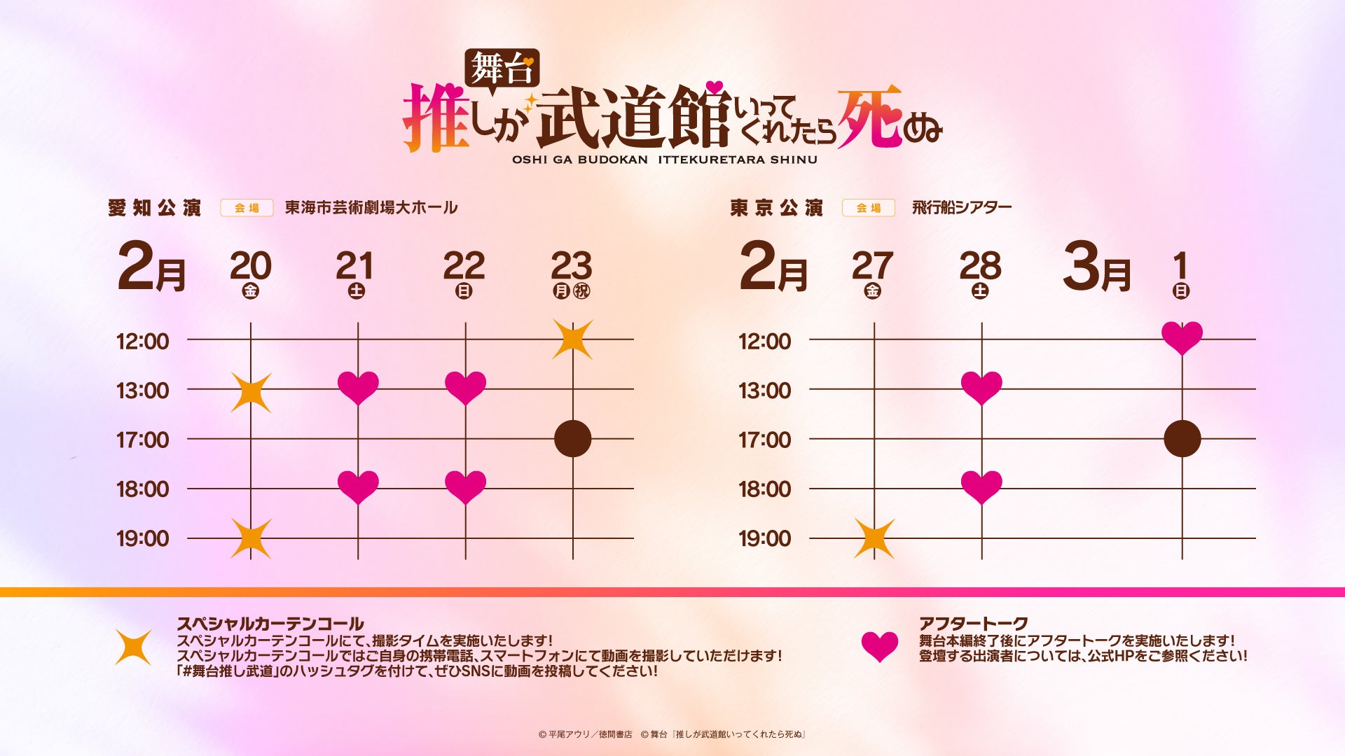 株式会社ブシロード(本社:東京都中野区、代表取締役社長:木谷高明)のグループ会社である株式会社劇団飛行船(本社:東京都中野区 代表取締役社長:山本陽介)は、2025年10月12日(日)に開催された、「SKE48 17th Anniversary Festival 2025」にて、舞台『推しが武道館にいってくれたら死ぬ』(原作:平尾アウリ/徳間書店コミックリュウ)に関する、詳細を解禁いたしました。