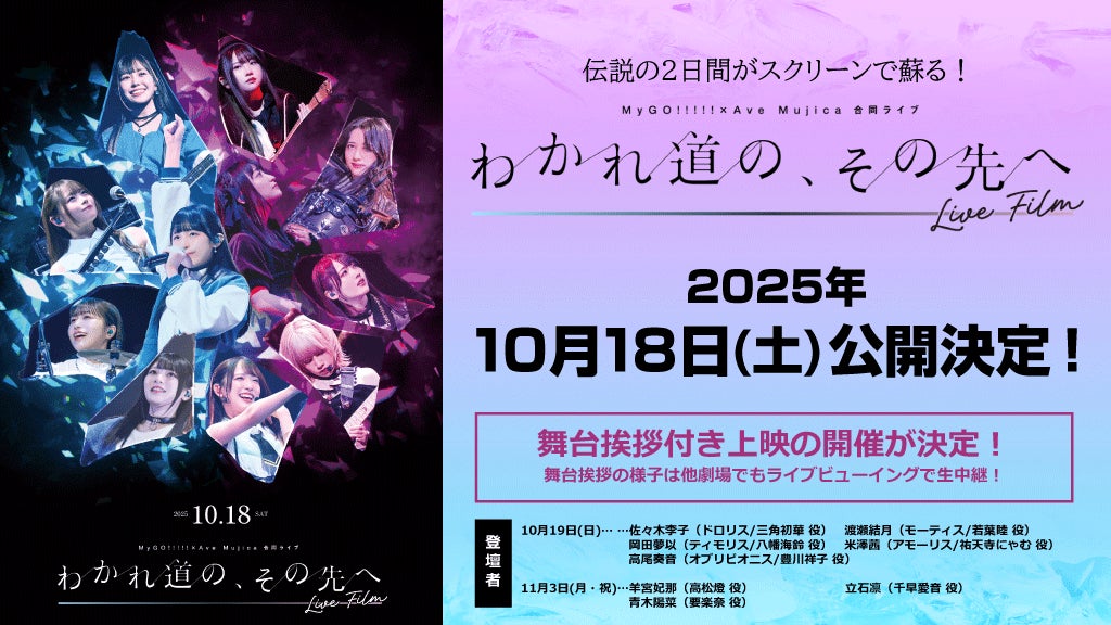 10月18日(土)に、MyGO!!!!!×Ave Mujica 合同ライブ「わかれ道の、その先へ」 LIVE FILMが公開されます。今年4月に開催されたMyGO!!!!!×Ave Mujica 合同ライブ「わかれ道の、その先へ」のライブ映像に加え、羊宮妃那(高松燈 役)・高尾奏音(オブリビオニス/豊川祥子 役)が特別出演するオリジナルカットも収録されたLIVE FILMとなっています。