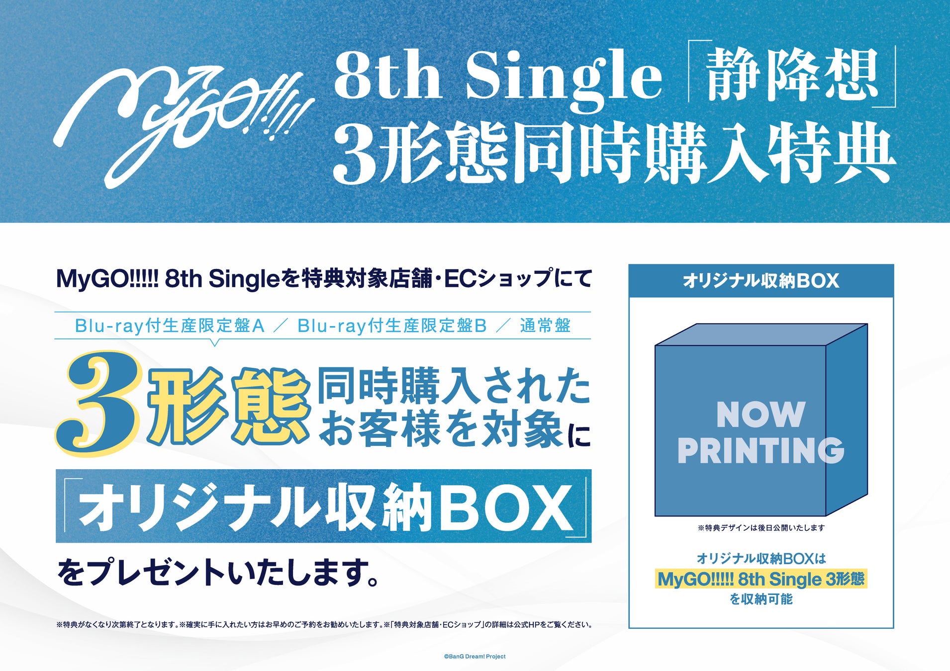 MyGO!!!!! 8th Single「静降想」を「特典配布対象店舗・ECショップ」にて3形態(Blu-ray付生産限定盤A・Blu-ray付生産限定盤B・通常盤)同時購入されたお客様を対象に、「オリジナル収納BOX」をプレゼントいたします。