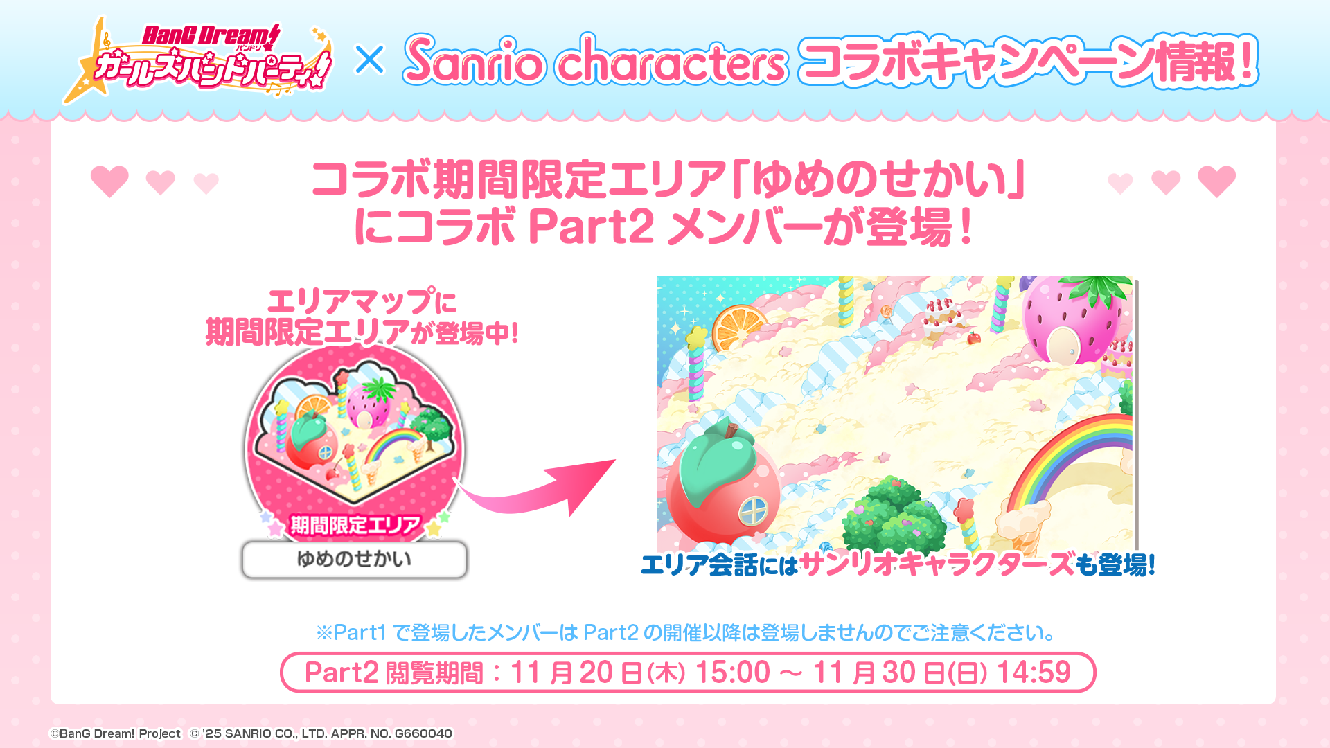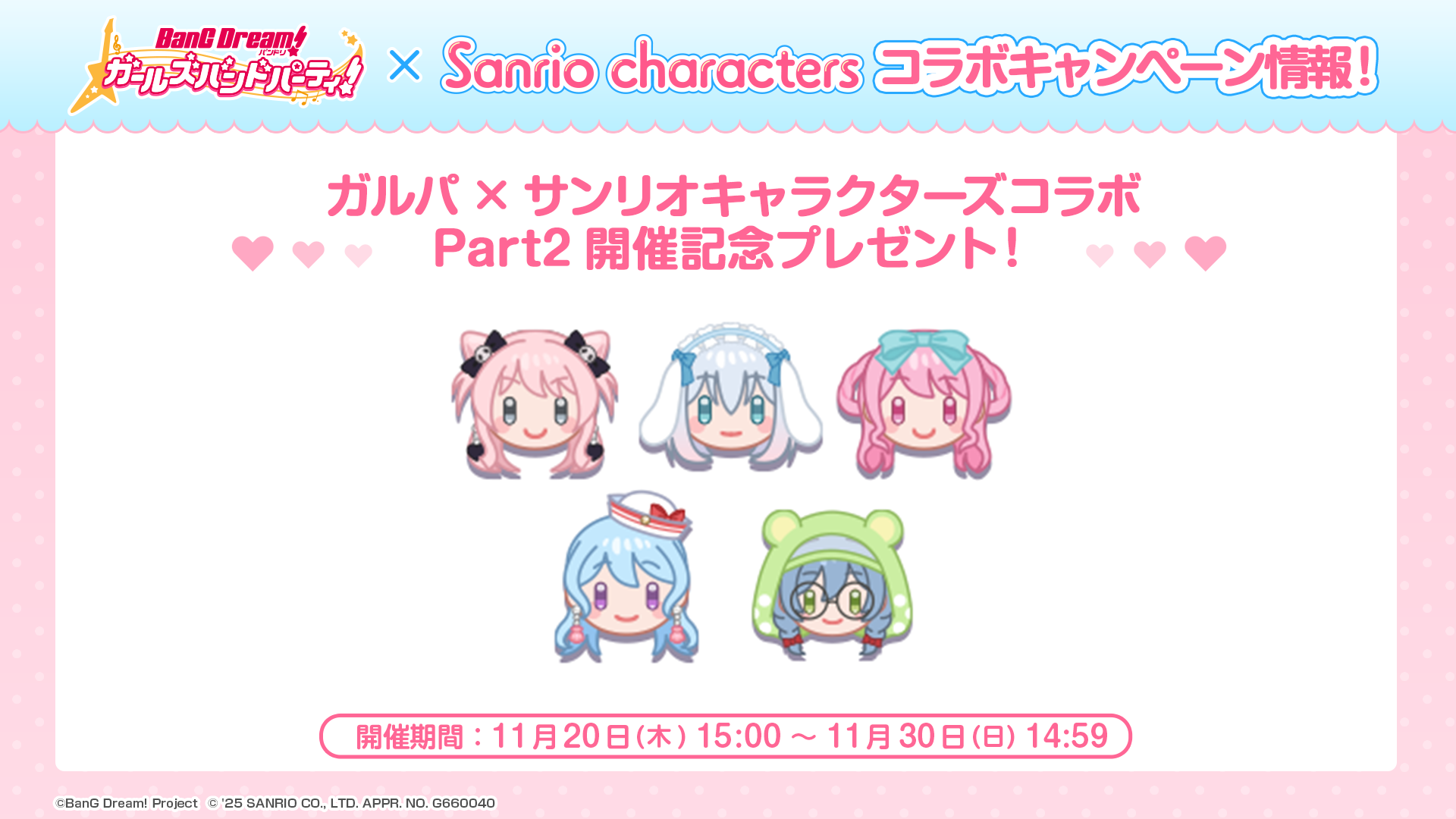 2025年11月20日(木)15時より、ガルパメンバーと株式会社サンリオのキャラクターたちが1キャラクターずつペアとなってコラボする「バンドリ! ガールズバンドパーティ×サンリオキャラクターズ」のPart2を開催いたします。