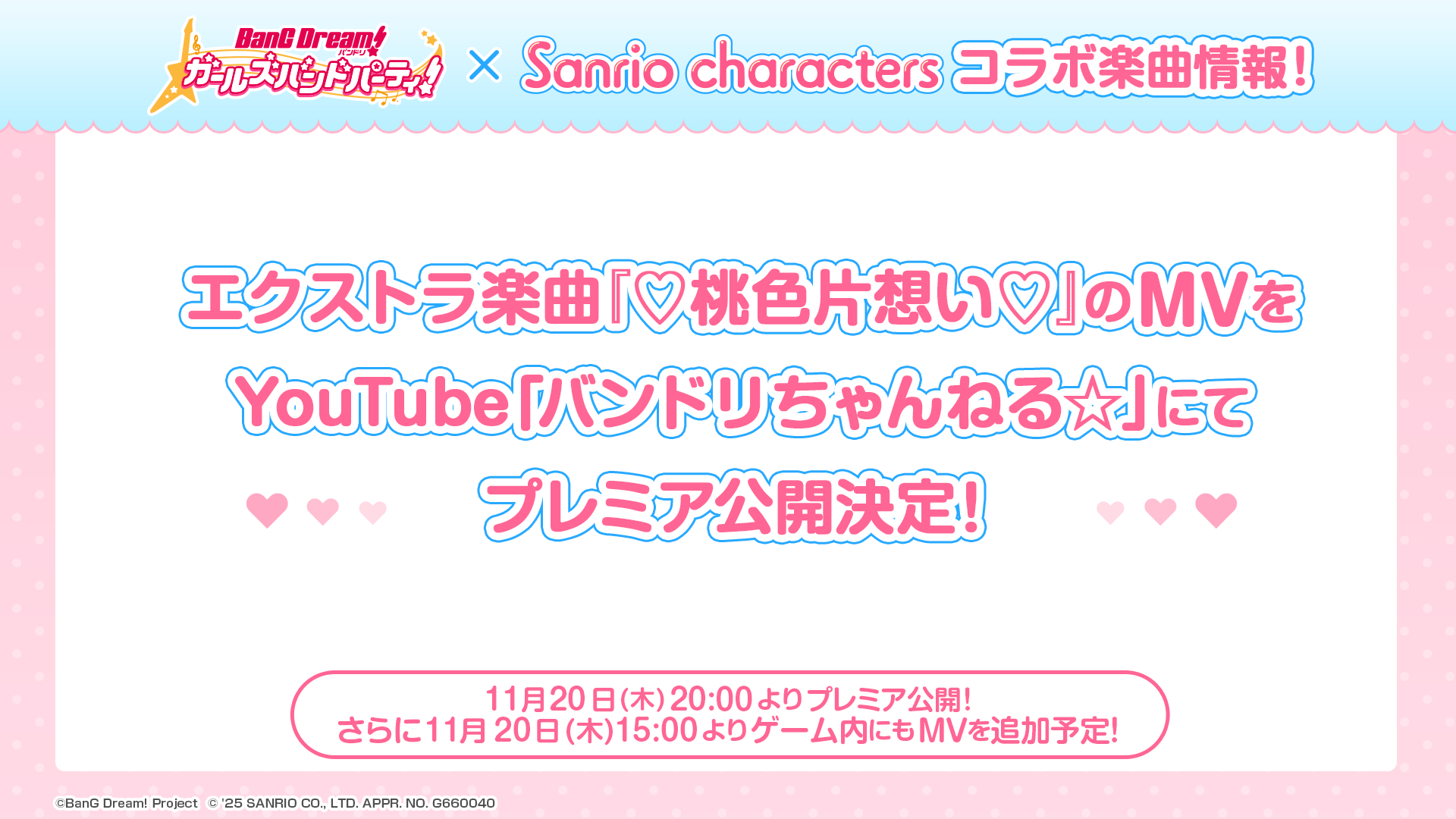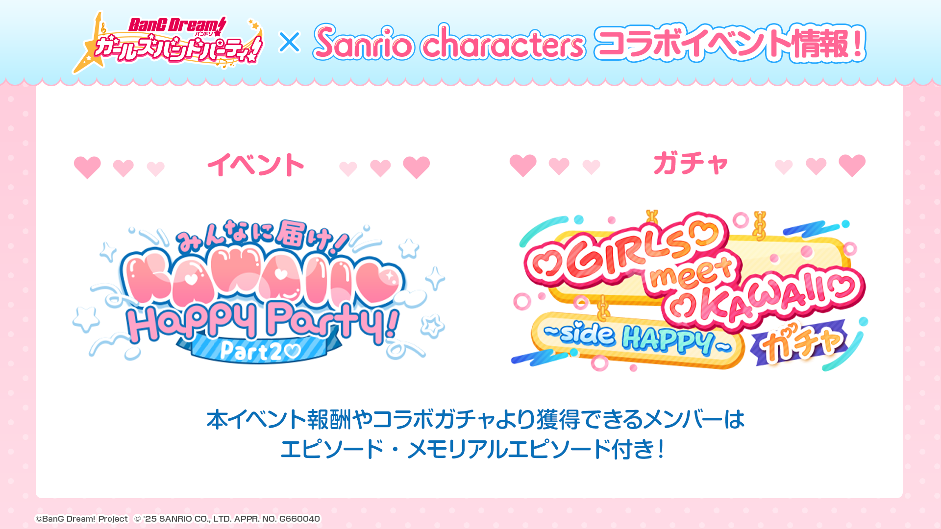 株式会社ブシロード(本社:東京都中野区 代表取締役社長:木谷高明、以下ブシロード)は、2025年11月13日(木)に配信いたしました「バンドリ!TV LIVE 2025」#289にて、スマートフォン向けゲーム「バンドリ! ガールズバンドパーティ!」(以下、ガルパ)での「バンドリ! ガールズバンドパーティ×サンリオキャラクターズ」コラボPart2の開催情報や、コラボ楽曲情報などを発表したことをお知らせします。