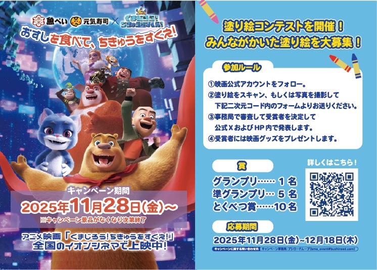 11月28日から全国公開のアニメ映画『くまじろう!ちきゅうをすくえ!』と大人気回転寿司チェーン「GENKI SUSHI」「魚べい」とのタイアップが決定!豪華賞品が当たるキャンペーンも開催!