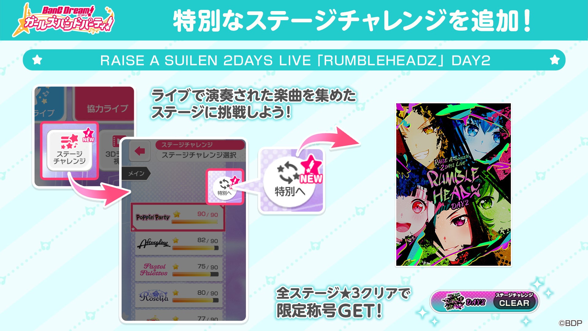スマートフォン向けゲーム「バンドリ! ガールズバンドパーティ!」内、ステージチャレンジ「特別」に、本ライブで演奏された楽曲を集めたステージを追加しました。