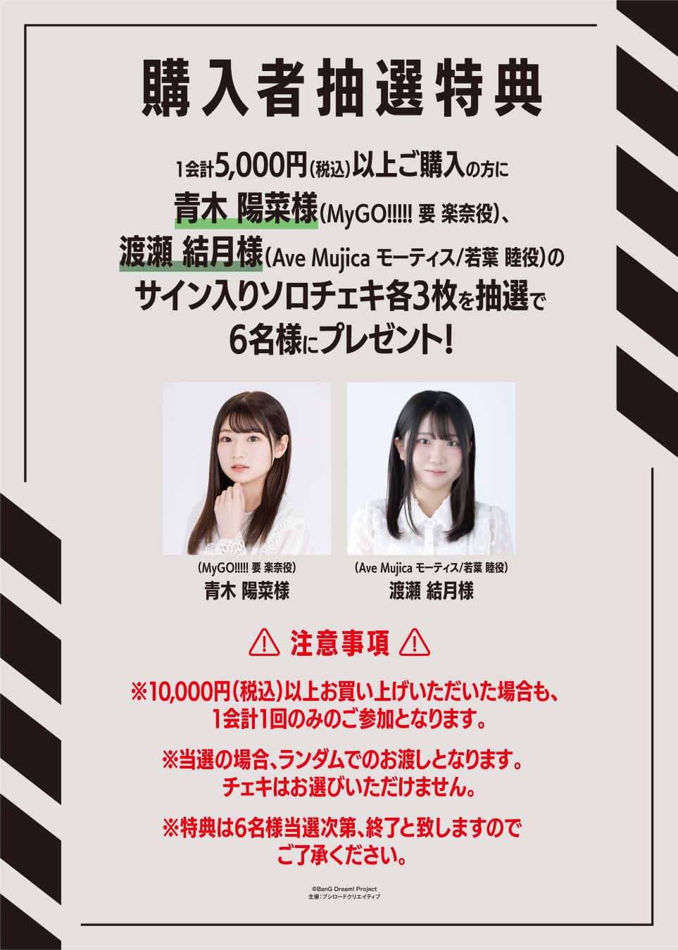 青木 陽菜様(MyGO!!!!! 要 楽奈役)、渡瀬 結月様(Ave Mujica モーティス/若葉 睦役)のサイン入りソロチェキ(抽選で合計6名様にプレゼント)