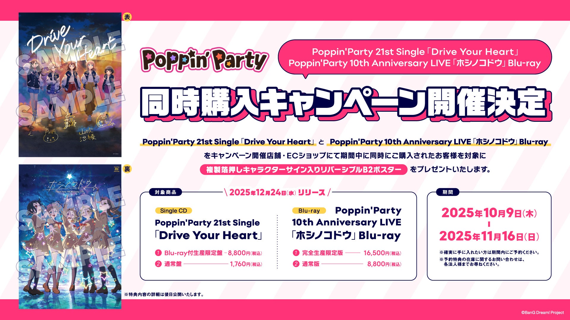 Poppin'Party 21st Single「Drive Your Heart」・10th Anniversary LIVE「ホシノコドウ」Blu-rayを「キャンペーン開催対象店舗・ECショップ」にて形態を問わず同時購入されたお客様を対象に先着で、「複製箔押しキャラクターサイン入りリバーシブルB2ポスター」をプレゼントいたします。