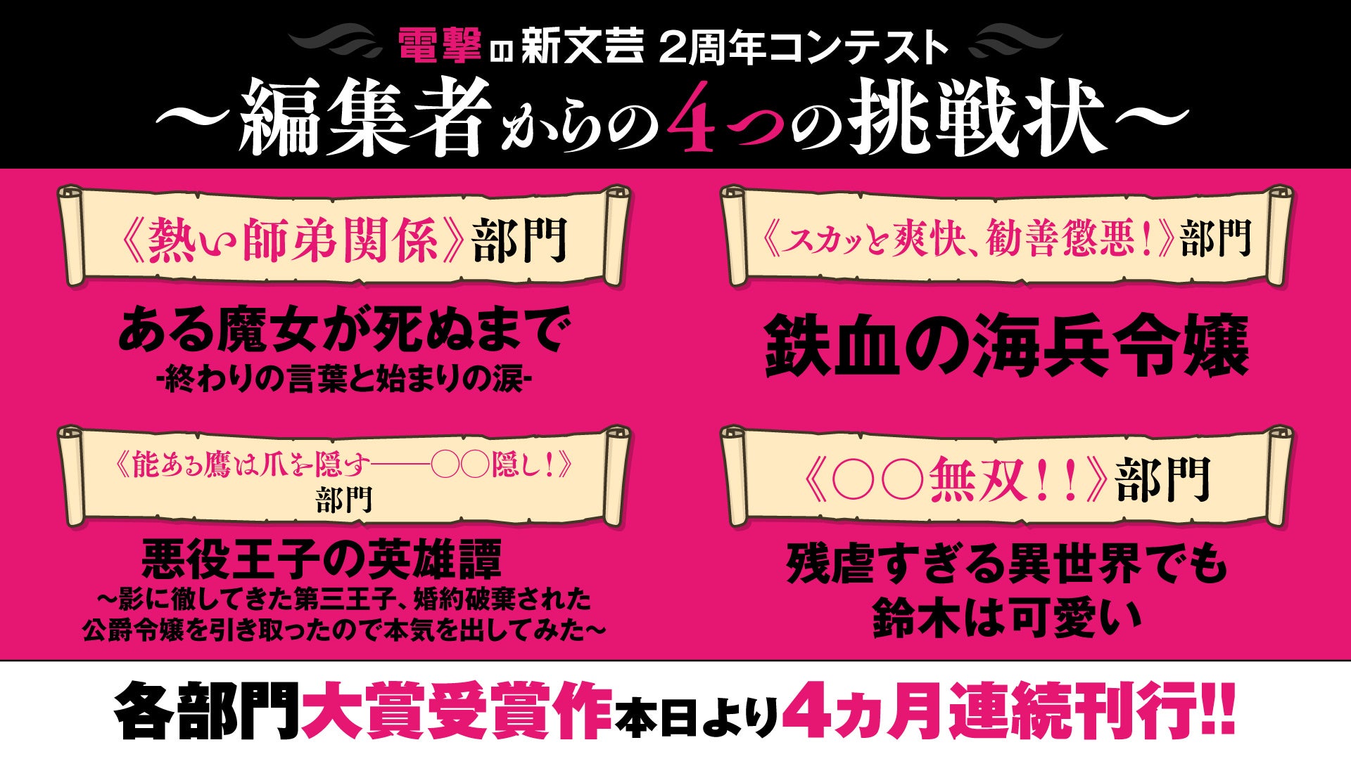 「電撃の新文芸2周年記念コンテスト ―編集者からの4つの挑戦状―」受賞作が本日より4ヵ月連続刊行!