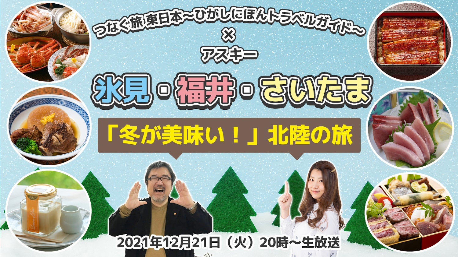 このたび、YouTubeを使ったライブ配信番組『つなぐ旅 東日本~ ひがしにほんトラベルガイド × アスキー生放送』を開始します。その1回目として、北陸2都市への旅の魅力を紹介する「氷見・福井・さいたま 「冬が美味い!」北陸の旅」を、2021年12月21日(火)20時より放送します。