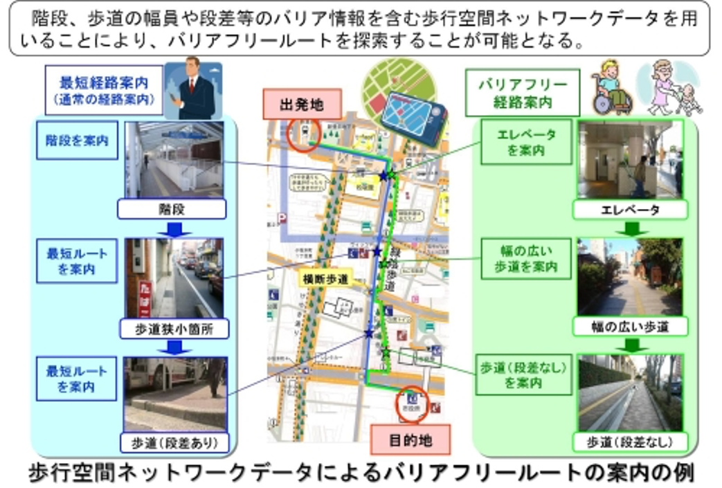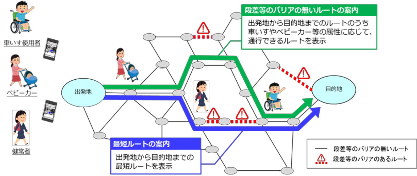 特に「バリアフリー・ナビプロジェクト(ICTを活用した歩行者移動支援の推進)」では、車いすの方が通行できる段差等のバリアのないルートを、スマートフォンを通じてナビゲーションする等、ICTを活用した歩行者移動支援サービスの普及のための取組を進めています。