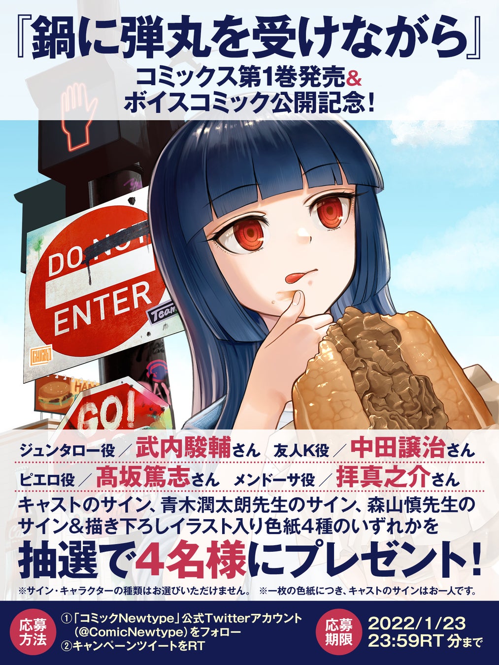 株式会社KADOKAWA(本社:東京都千代田区、代表取締役社長:夏野剛)は、SNSで話題沸騰中のノンフィクション&カオス&ハードグルメリポートコミック、「鍋に弾丸を受けながら」第1巻を本日2022年1月8日(土)に発売いたします。また、発売を記念して、中田譲治さん、武内駿輔さんほか、豪華声優陣が出演するボイスコミックも公開いたします。