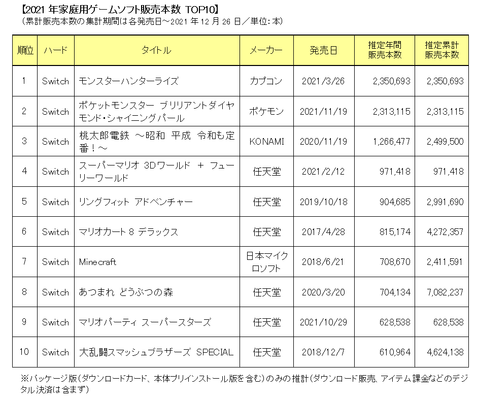 ゲーム総合情報メディア「ファミ通」は、2021年の国内家庭用ゲームソフト(パッケージ版のみ)とハードの売上速報をまとめました。集計期間は2020年12月28日~2021年12月26日です。