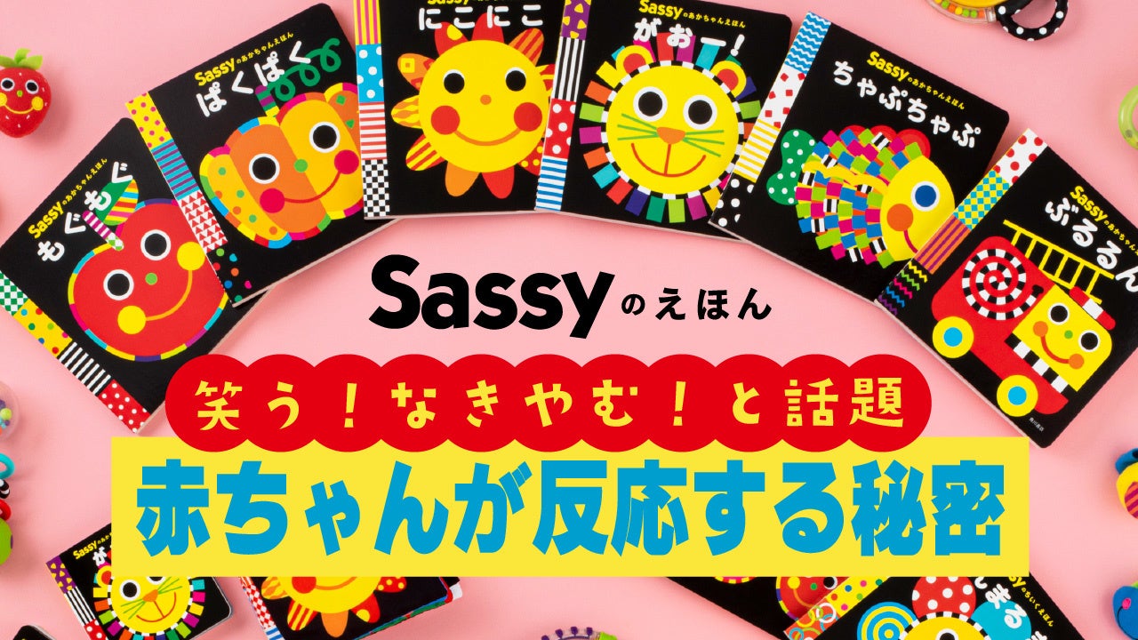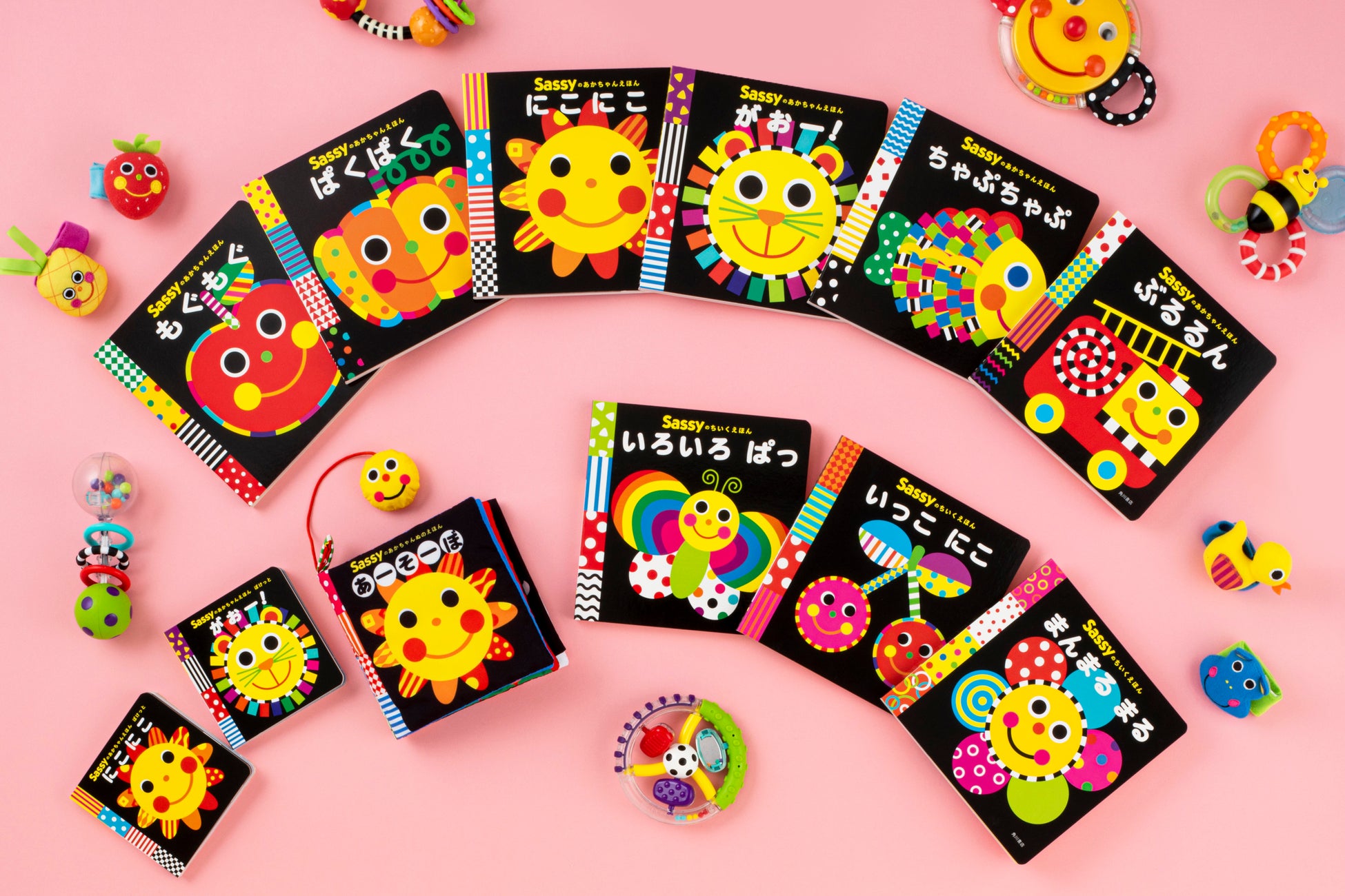 赤ちゃんの目を通して心と脳を育むSassyのグラフィックに、赤ちゃんが大好きなオノマトペを組み合わせた、0歳の誕生日から楽しめる絵本シリーズ!