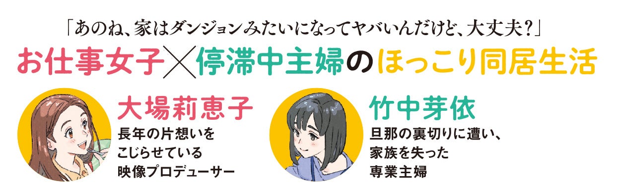 仕事ばかりして、生活も恋も後回しにしてきた映像プロデューサーの莉恵子と、旦那の裏切りから、幸せだと思っていた結婚生活を住む場所と共に失った専業主婦の芽依。本作は、そんな生活も恋も家族もあきらめかけていた二人の女性が、温かく楽しい同居生活を送りながら、自分らしい生き方を見つけていく物語です。