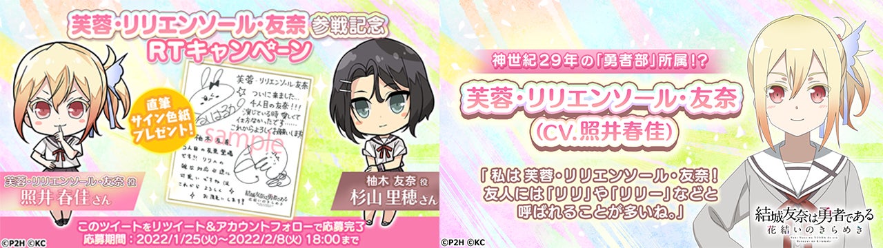 『ゆゆゆい』公式Twitterをフォロー&該当ツイートをリツイートすることで、芙蓉・リリエンソール・友奈役の照井春佳さんと柚木友奈役の杉山里穂さんサイン色紙プレゼントへの応募が出来ます。