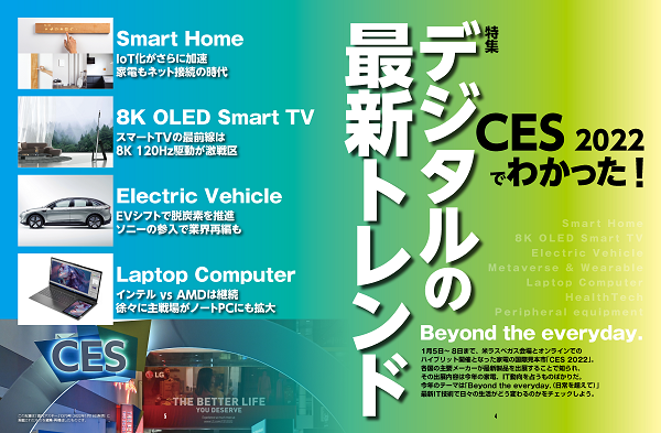 巻頭特集では2022年のデジタル市場やIT業界を大予測!テレビやパソコンはもちろん、スマート家電やEV、メタバースなどIT&デジタルガジェットの重要トピックスを、有識者のコメントも交えつつ多角的に紹介します。