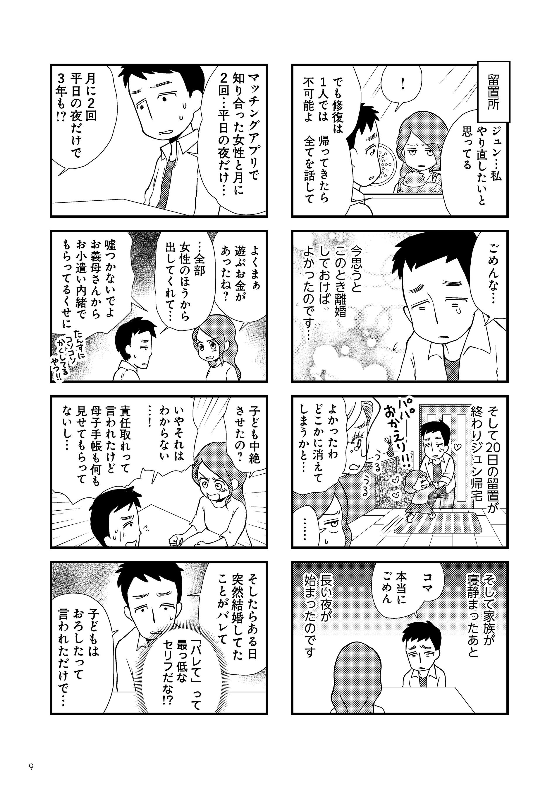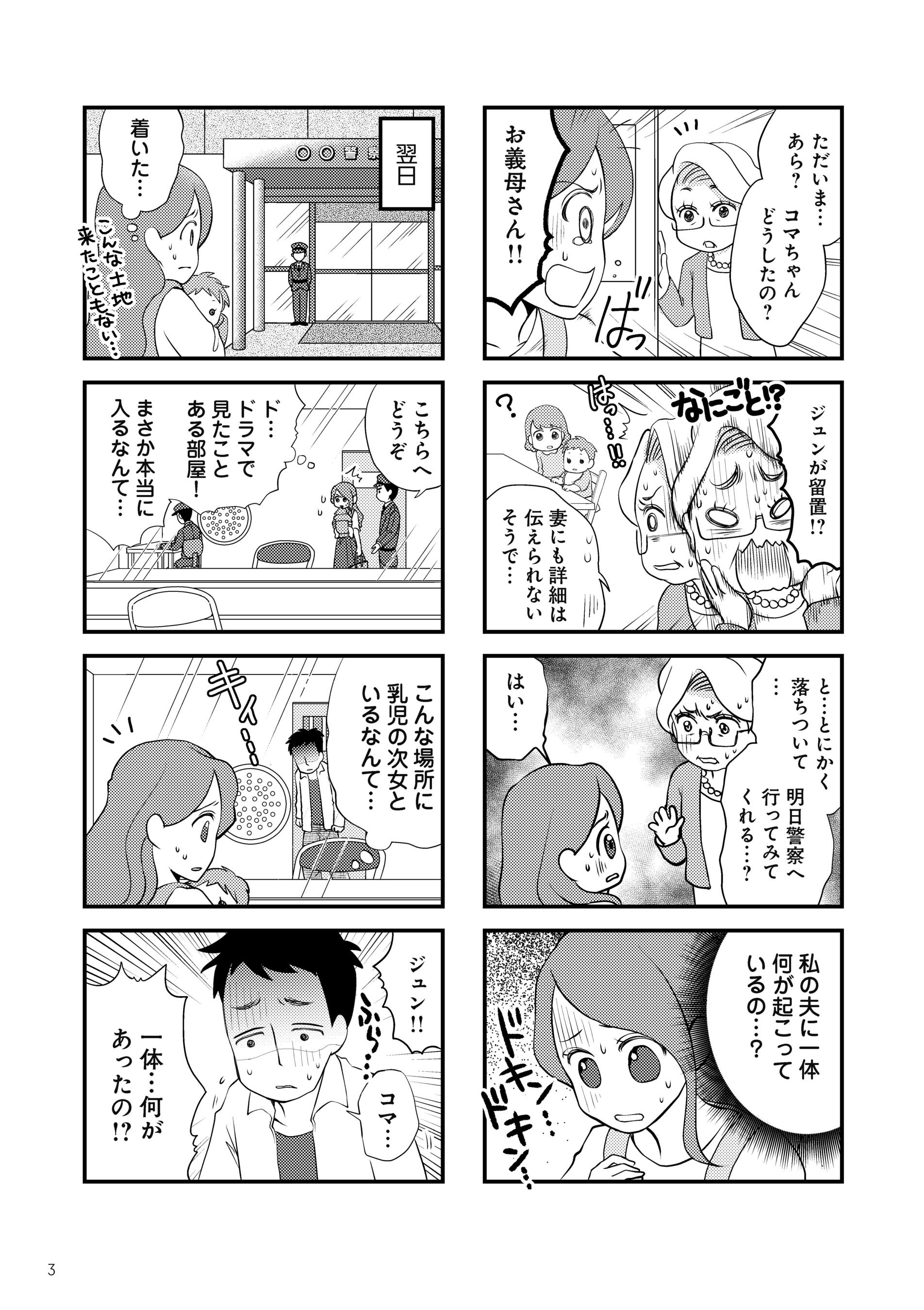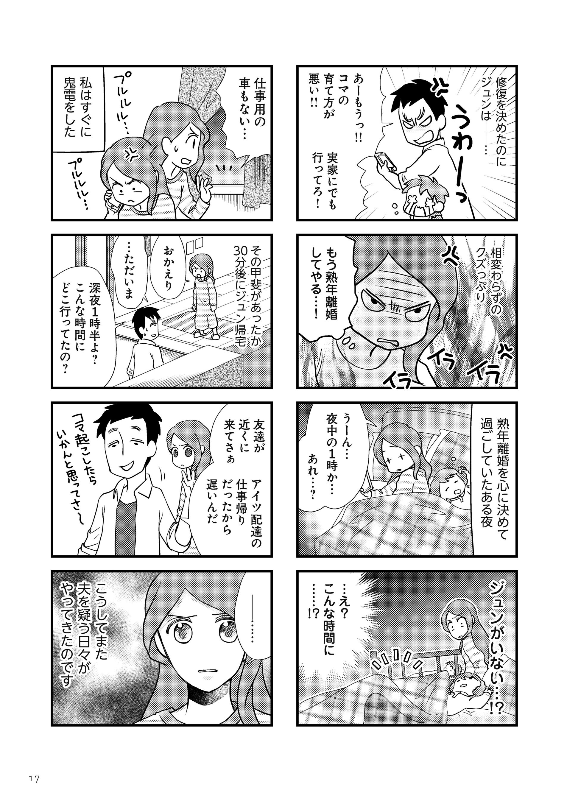 専業主婦のコマは過去旦那の不倫で警察沙汰&慰謝料などで振り回された経験があることから、旦那に不倫は二度としないと約束させていた。にもかかわらず、またも不倫の匂い! コマは探偵事務所に相談することに。