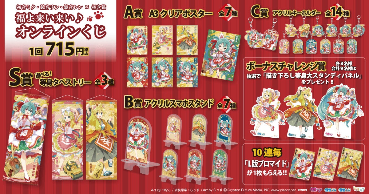 株式会社KADOKAWA(本社:東京都千代田区、代表取締役社長:夏野 剛 以下KADOKAWA)は、運営するオンラインくじサービス「くじ引き堂」において、「初音ミク・鏡音リン・鏡音レン×招き猫 福よ来い来い♪オンラインくじ」を、2022年2月22日(日)17時より販売します。