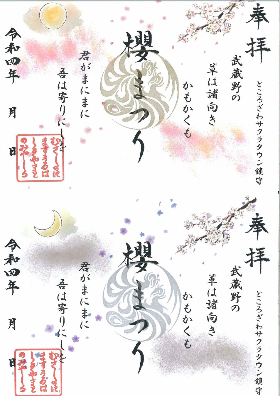 「サクラまつり2022」会期中、武蔵野坐令和神社にて、桜や和歌をあしらった期間限定の記念御朱印(2種)を頒布いたします。