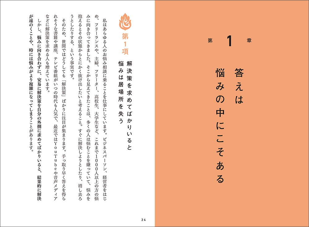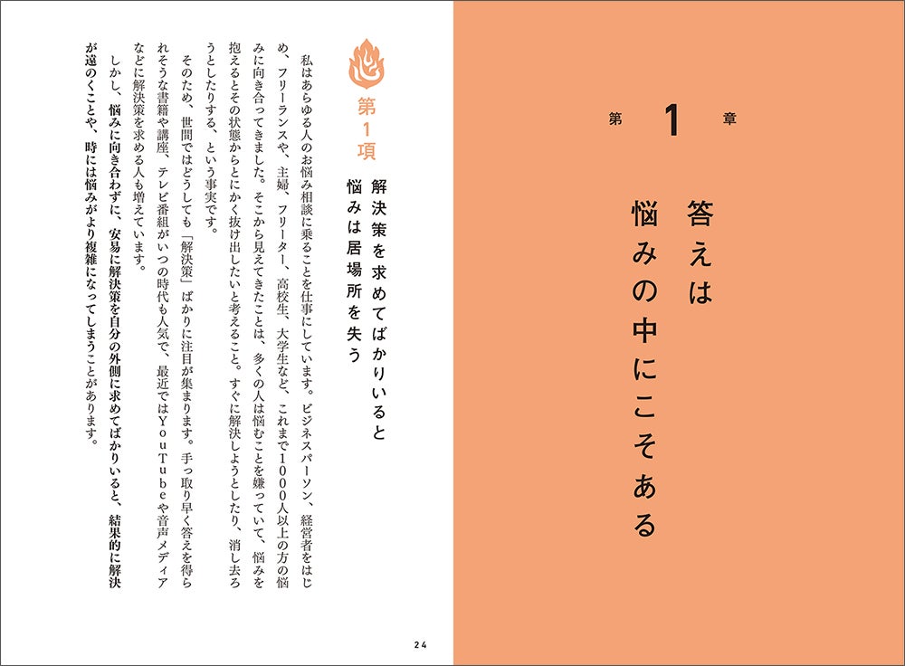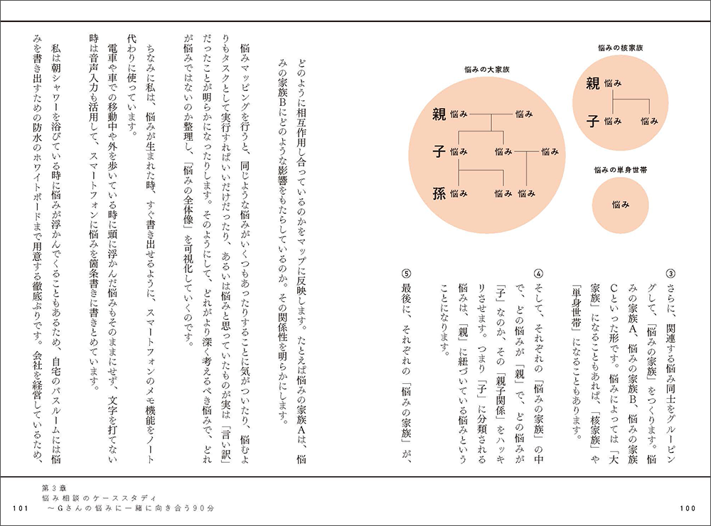 そこで本書では、この一筋縄ではいかない悩みとの「向き合い方」について、これまで千人以上の悩みに向き合ってきた私の経験を基に、様々な事例を上げて余すところなくお伝えしています。