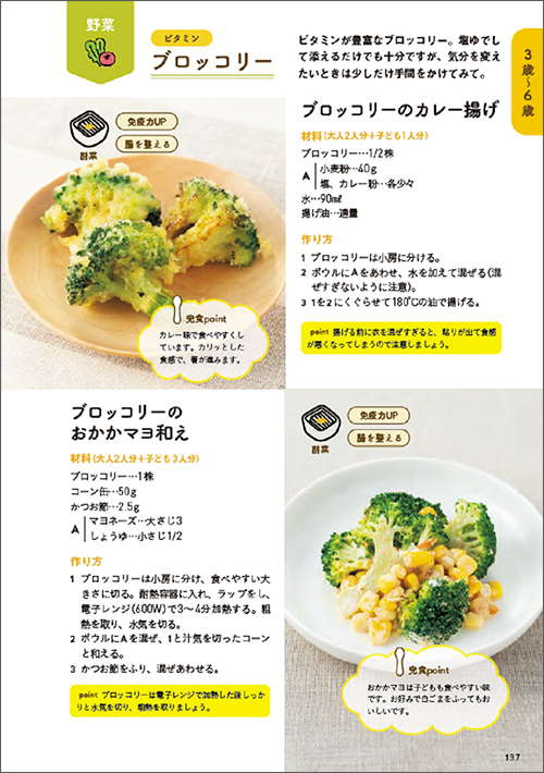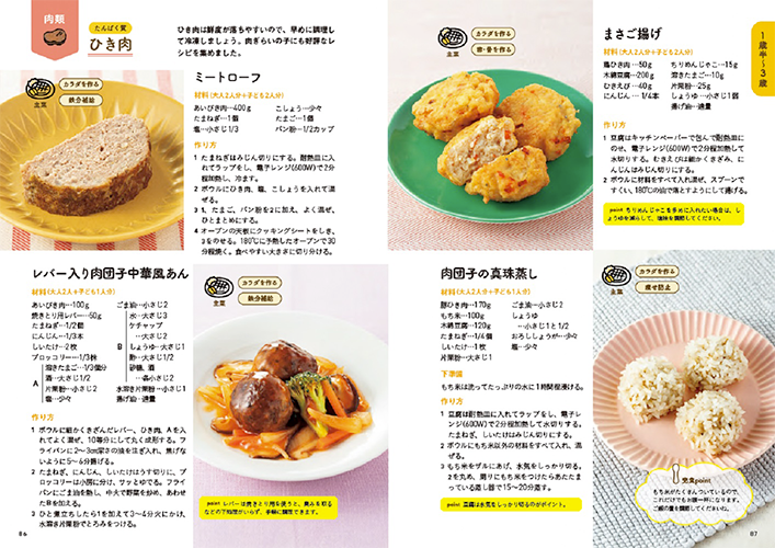 →メインの食材別レシピのほか、時期別の子どもの特徴、1日の食事量の目安、幼児食のよくあるお悩みQ&A、マネするだけ!献立カレンダー、困ったときのお助けテク&レシピ、〇〇するだけ!お助けレシピなど