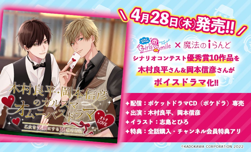 株式会社KADOKAWA(本社:東京都千代田区、代表取締役社長:夏野剛)は、動画サービス「niconico」にて運営しているニコニコチャンネル「木村良平・岡本信彦の電撃Girl's&Boy'sSmile」において、自社で運営する小説投稿サイト「魔法のiらんど」とコラボしたシナリオコンテストを開催。優秀作品10作品に選ばれた作品をボイスドラマ化し、2022年4月28日(木)より「ポケットドラマCD(ポケドラ)」にて販売開始いたしました。また、同日に優秀作品10作品の中から選ばれた大賞及びユーザー賞をコンテストページ、同日配信のWEBラジオ、ニコニコチャンネル内ブロマガにて発表しております。