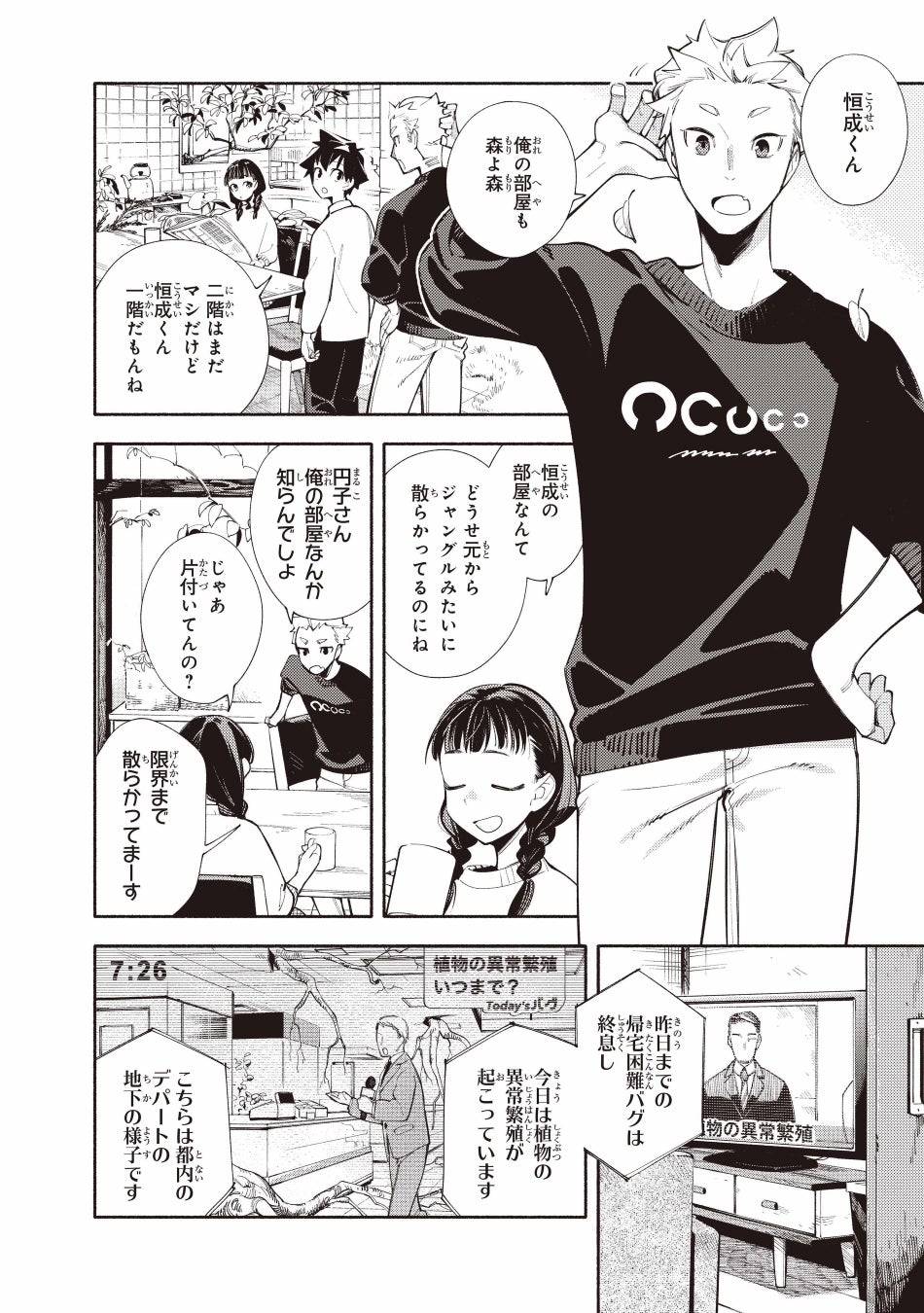 シェアハウスの大家にして"バグ"に心躍らせる研究者のお姉さん・かさねと、彼女とひとつ屋根の下で暮らしながら助手を務める中学生の男の子・紺は、へんてこな世界で今日もおかしな一日を過ごします。