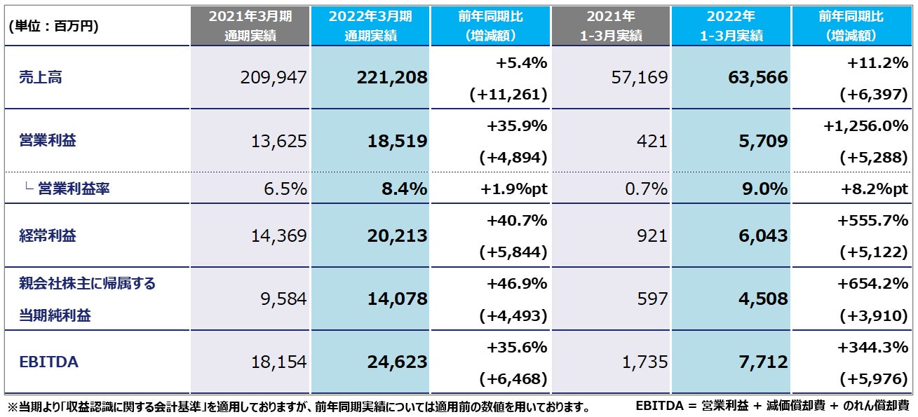 ・2022 年 3 月期通期連結業績は、前年同期比で売上高が +5.4 %、営業利益が +35.9 % と伸長し、過去最高(*)の売上高、営業利益、営業利益率を達成。