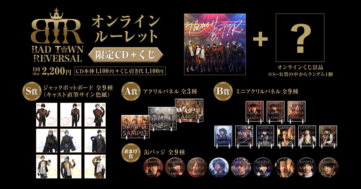 | <BAD TOWN REVERSAL オンラインルーレット(限定CD+くじ) 概要> 販売期間: 2022年6月9日(木)12:00~2022年6月30日(木)11:59 販売価格:1回 2,200円(税込) ※限定CD 1,100円+くじ引き代 1,100円 ※別途発送手数料が掛かります。 購入ページ:https://kujibikido.com/lp/badtownreversal/ |