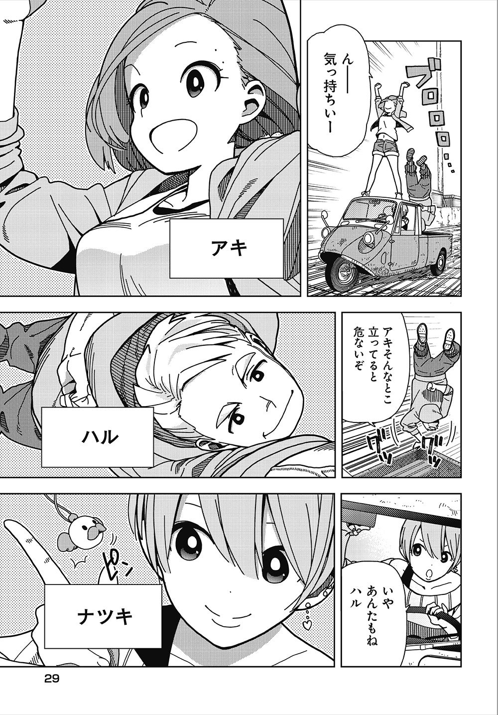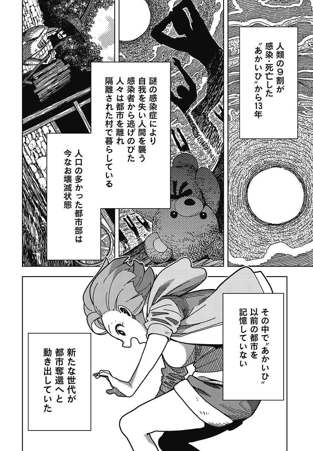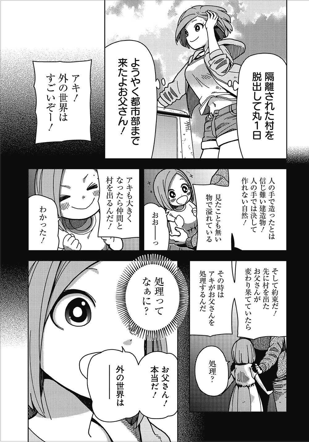 壊滅前の世界を記憶していない新世代のアキはかつて村を出て行った父親を捜すため、仲の良いハル、ナツキと共に村を抜け出す。