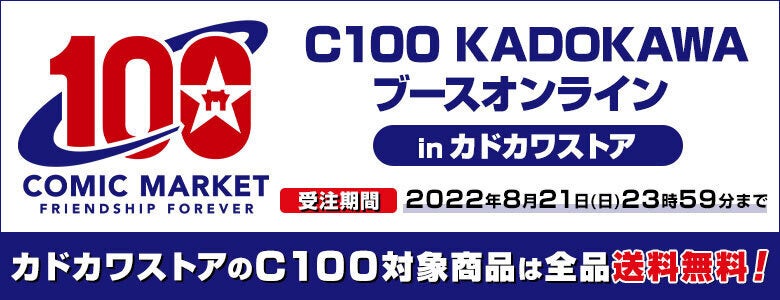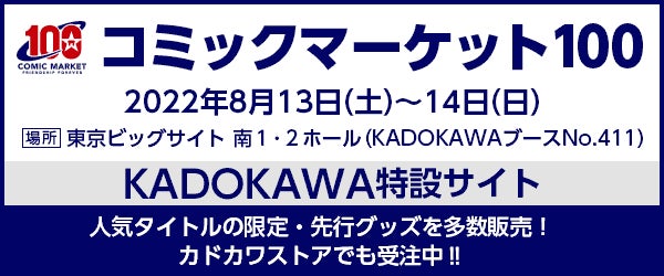 株式会社KADOKAWA(本社:東京都千代田区 代表取締役社長:夏野 剛)は、8月13日(土)・14日(日) に東京ビッグサイトで開催予定のコミックマーケット100に企業出展! 当日ブースで販売する全商品ラインナップをKADOKAWAコミケ特設サイトで公開いたしました。 また公式オンラインショップ「カドカワストア」では、一部商品を除きブース販売商品の事前予約を受付中です。コミケ商品を対象に送料無料キャンペーンも実施中なので、合わせてご利用ください。