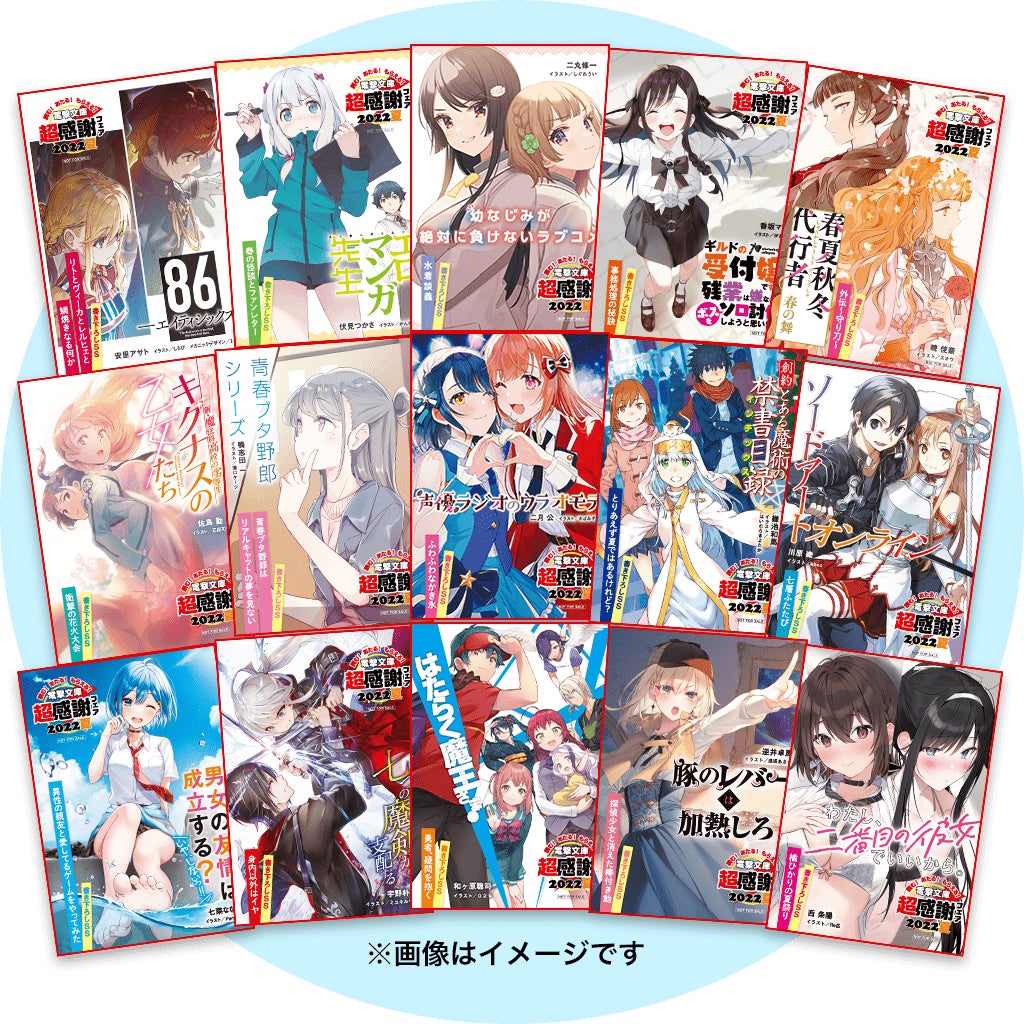 | 【超感謝フェア2022夏 限定SSリーフレット ラインナップ】 『86―エイティシックス―』『エロマンガ先生』『幼なじみが絶対に負けないラブコメ』『ギルドの受付嬢ですが、残業は嫌なのでボスをソロ討伐しようと思います』『春夏秋冬代行者』『新・魔法科高校の劣等生 キグナスの乙女たち』『青春ブタ野郎はバニーガール先輩の夢を見ない』『声優ラジオのウラオモテ』『創約 とある魔術の禁書目録(インデックス)』『ソードアート・オンライン』『男女の友情は成立する?(いや、しないっ!!)』『七つの魔剣が支配する』『はたらく魔王さま!』『豚のレバーは加熱しろ』『わたし、二番目の彼女でいいから。』 ※50音順 |