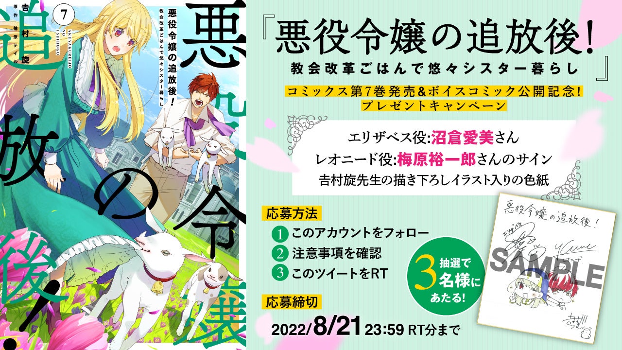 【CV:梅原裕一郎・沼倉愛美のボイスコミック公開!】累計75万部突破の『悪役令嬢の追放後! 教会改革ごはんで悠々シスター暮らし』第7巻本日発売‼ 直筆サイン入り色紙が当たるプレゼントキャンペーンも!