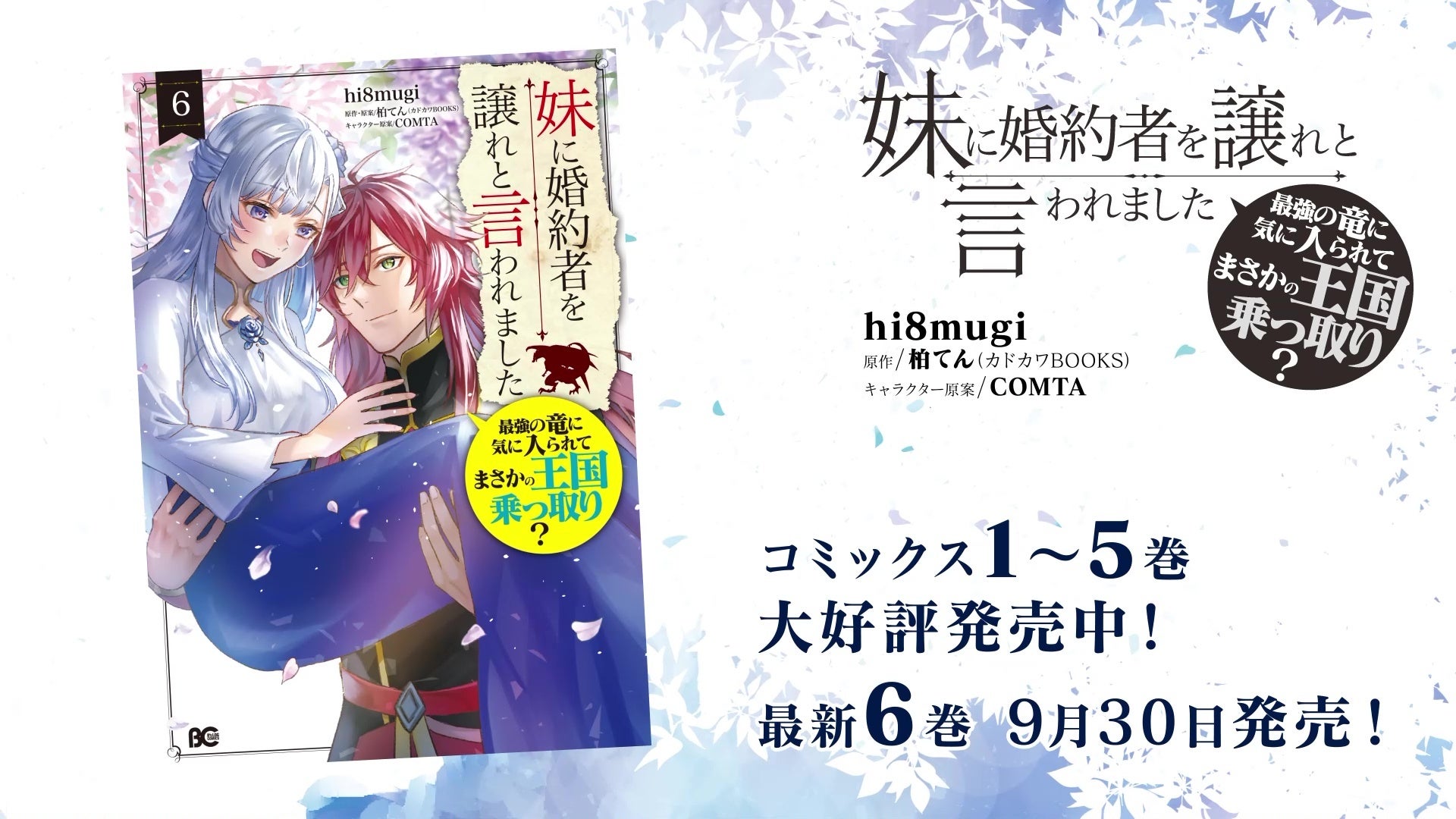 株式会社KADOKAWA(所在地:東京都千代田区/代表取締役社長:夏野剛)は、『妹に婚約者を譲れと言われました 最強の竜に気に入られてまさかの王国乗っ取り? 』(漫画:hi8mugi、原作・原案:柏てん、キャラクター原案:COMTA)コミックス6巻を本日、2022年9月30日(金)に刊行いたしました。さらに、本作の発売を記念し、豪華キャストによるボイスコミックPVも本日公開いたしました。