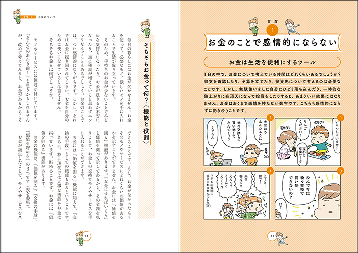 50万部を突破した『お金の超基本』の著者である坂本綾子さんと、人気漫画イラストレーターのアベナオミさんがタッグを組み、「難しい」「面倒くさい」と思われがちなお金の話を、日常生活のなかでありがちな4コマ漫画のエピソードに紐づけて、わかりやすく解説しています。