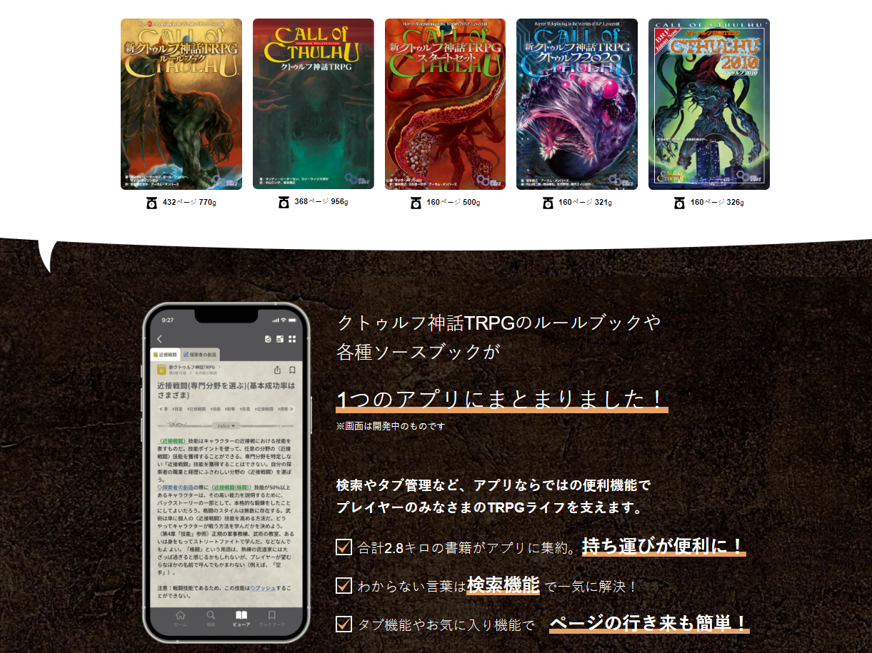 合計※約2.8kg、1200ページ以上あった書籍をアプリ化することで、持ち運びがしやすくなり、いつでもどこでもクトゥルフ神話TRPGをプレイできます。また、検索やタグ、ブックマーク機能などアプリならではの機能も搭載。プレイヤーの皆さんのTRPGライフを支えます。