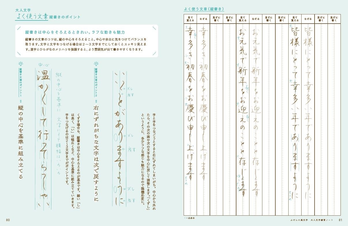 「ふだん使いの美文字」をマスターしたい方に向けた『ふだんの美文字』シリーズ3作目となる今回は、大人文字(ちょっとつなげる、くずす)に挑戦できる書き込み式のドリルです。