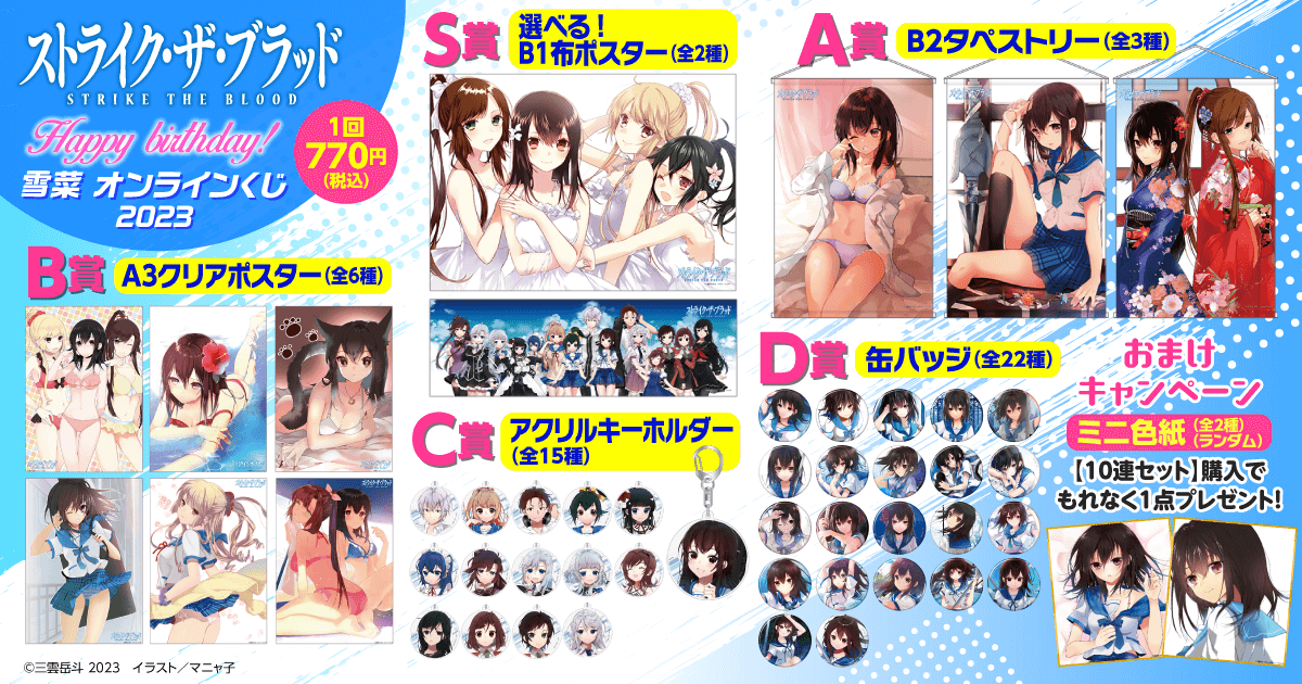 | <『ストライク・ザ・ブラッド』Happy birthday! 雪菜 オンラインくじ 2023 概要> 販売期間:2022年12月22日(木)17:00~2023年1月12日(木)16:59 販売価格:1回 770円(税込)※別途発送手数料が掛かります。 購入ページ:https://kujibikido.com/lp/striketheblood-yukina2023/ |