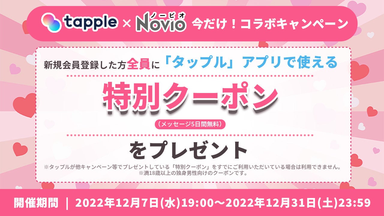 このキャンペーンでは、開催期間中に『NOVIO』に新規ユーザー登録した方全員に『タップル』で5日間メッセージし放題の特別クーポンをお送りします。