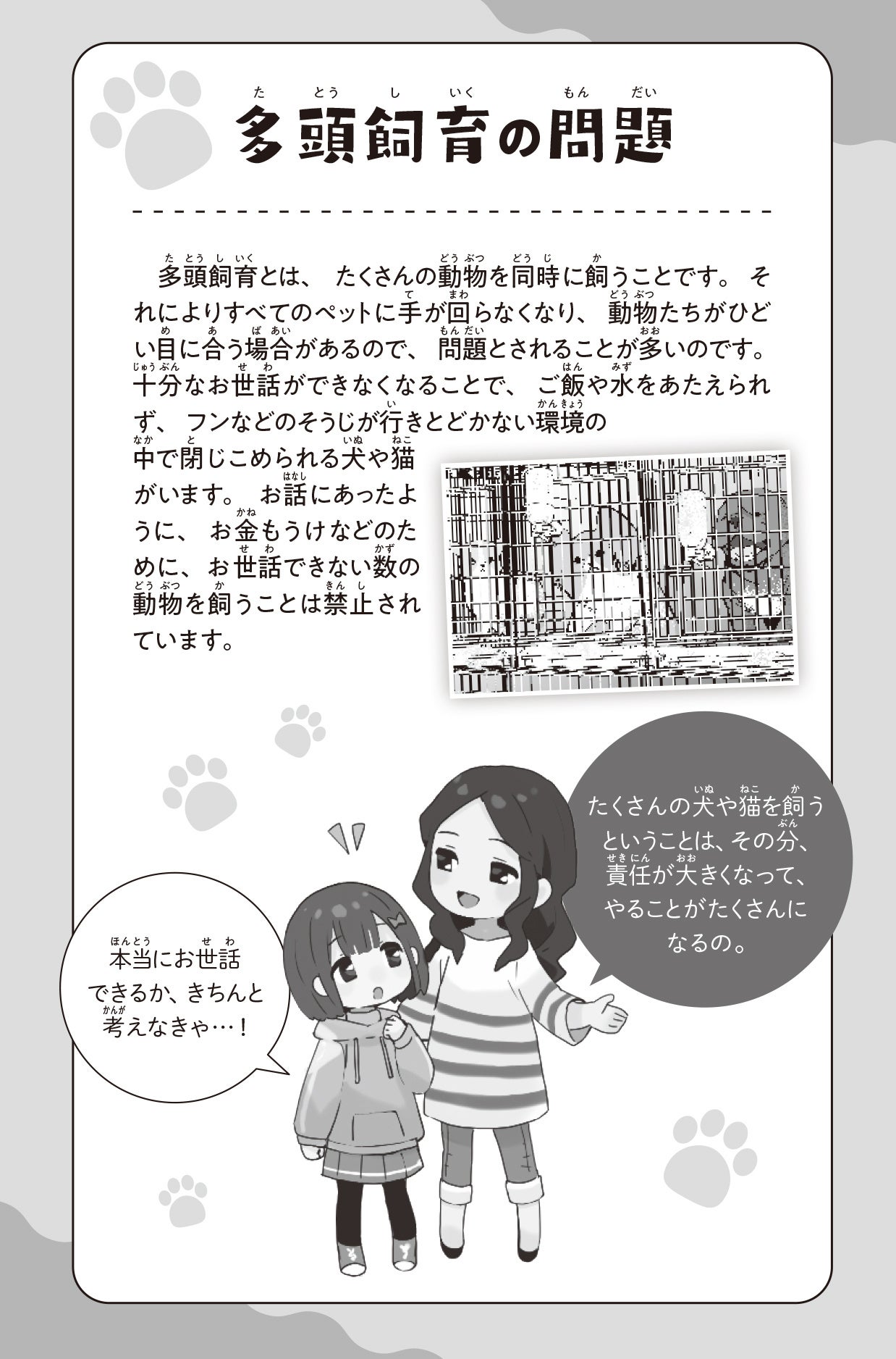 各章末には、短編のストーリーに関するコラムを掲載。どうぶつの飼育環境をとり巻く問題や、ペットを迎える前のチェックリストなどが、お子さんにも分かりやすくまとめられています。