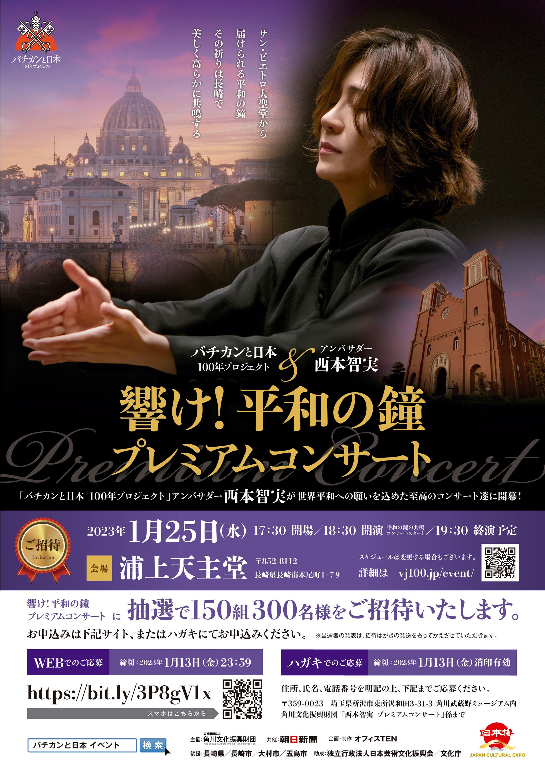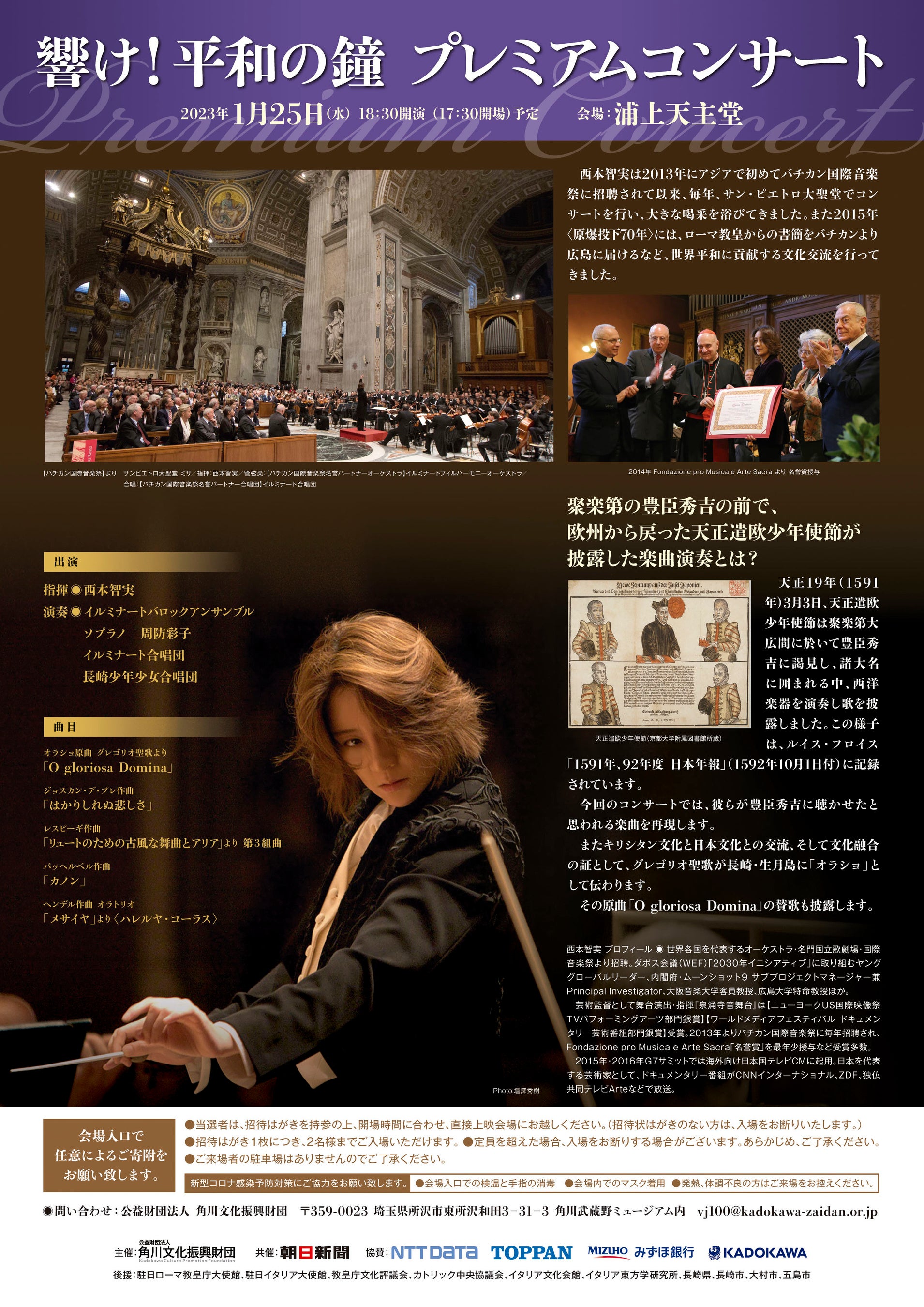 日本の文化振興に寄与するための事業を手掛ける公益財団法人 角川文化振興財団(理事長:川上量生)は、 「バチカンと日本 100年プロジェクト」の関連プログラムのひとつとして、世界的指揮者であり、本プロジェクトのアンバサダーである西本智実が世界平和への願いを込めて贈る 「響け!平和の鐘 プレミアムコンサート」 を、2023年1月25日(水)、長崎県長崎市の浦上天主堂にて開催いたします。