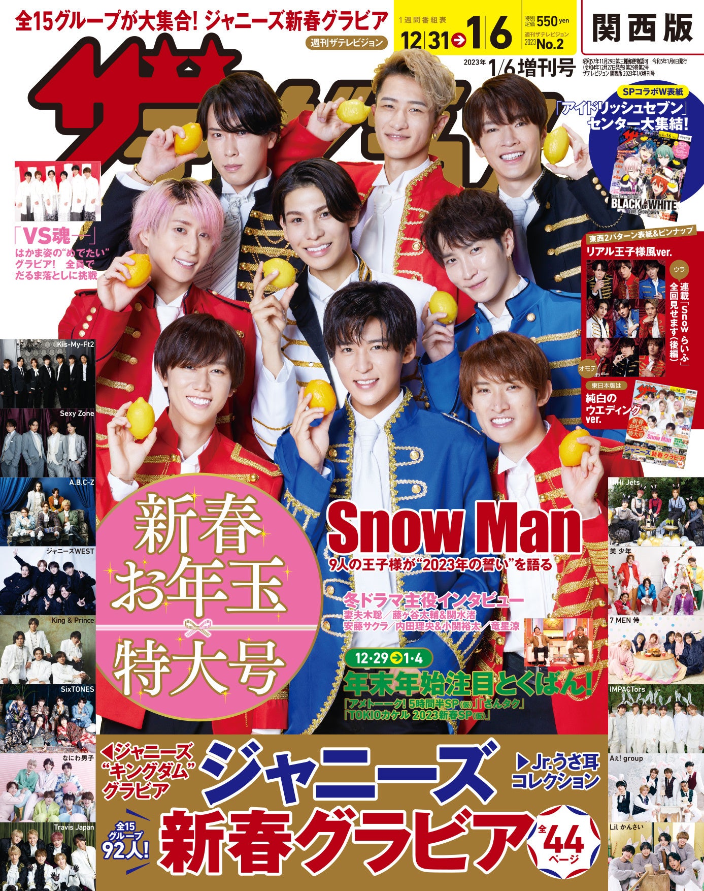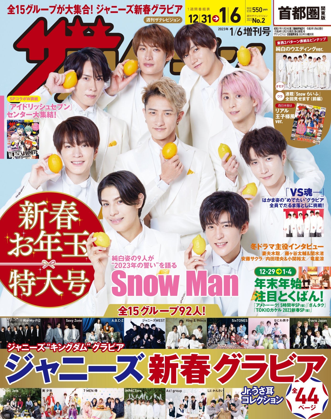 『週刊ザテレビジョン』最新号は、新春お年玉特大号と題し、Snow Manが登場!リアル王子様&純白ウエディングの衣裳で、東西2パターン表紙に。さらに刷り分けピンナップも付く。また、新春SPグラビアでは、Kis-My-Ft2、Sexy Zone、A.B.C-Z、ジャニーズWEST、King & Prince、SixTONES、なにわ男子、Travis Japanの「ジャニーズキングダム」グラビアを掲載。“国を築いたら”をテーマに、役職と国の3カ条を発表。ジャニーズJr.からは、HiHi Jets、美 少年、7 MEN 侍、IMPACTors、Aぇ! group、Lil かんさいが全員耳を付けてウサギに変身する“うさ耳”グラビアを披露する。