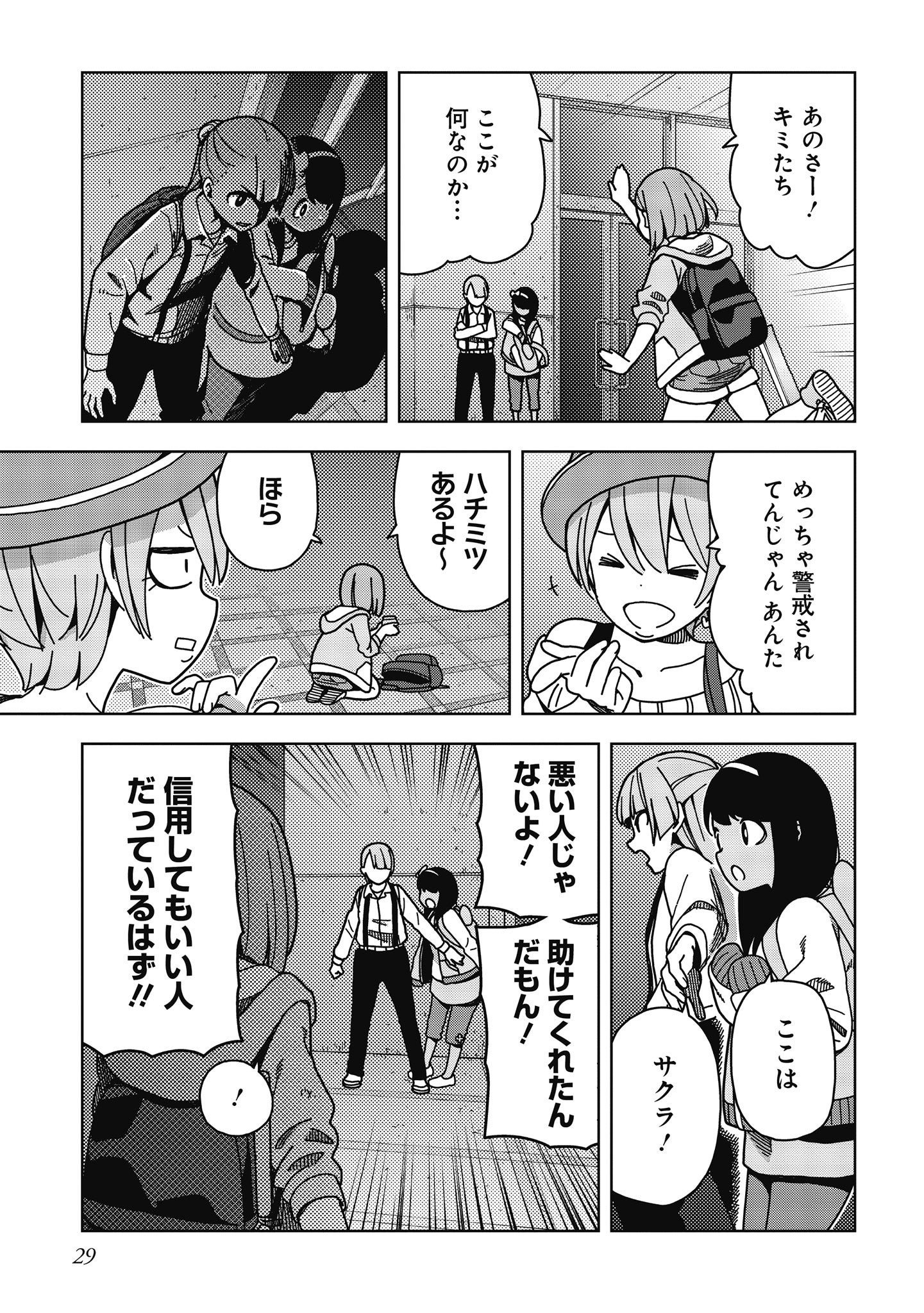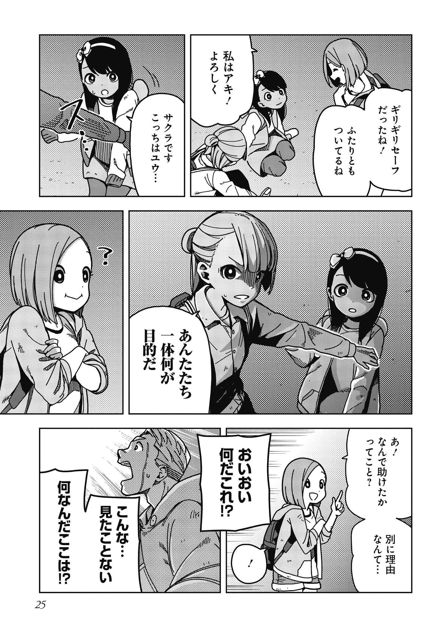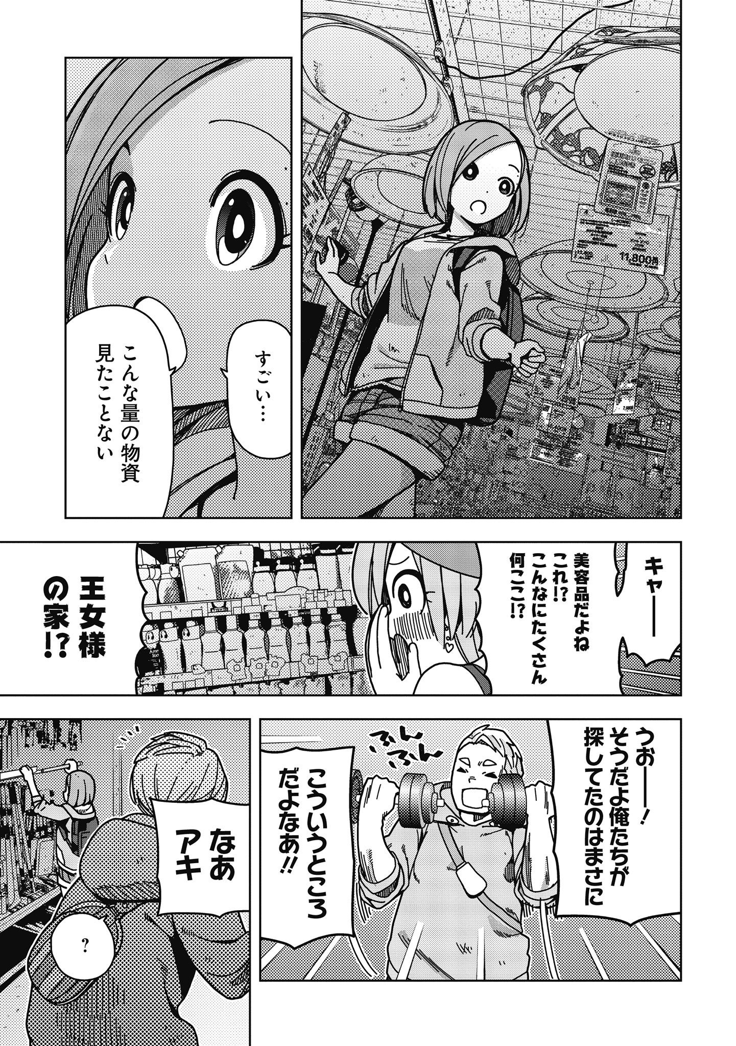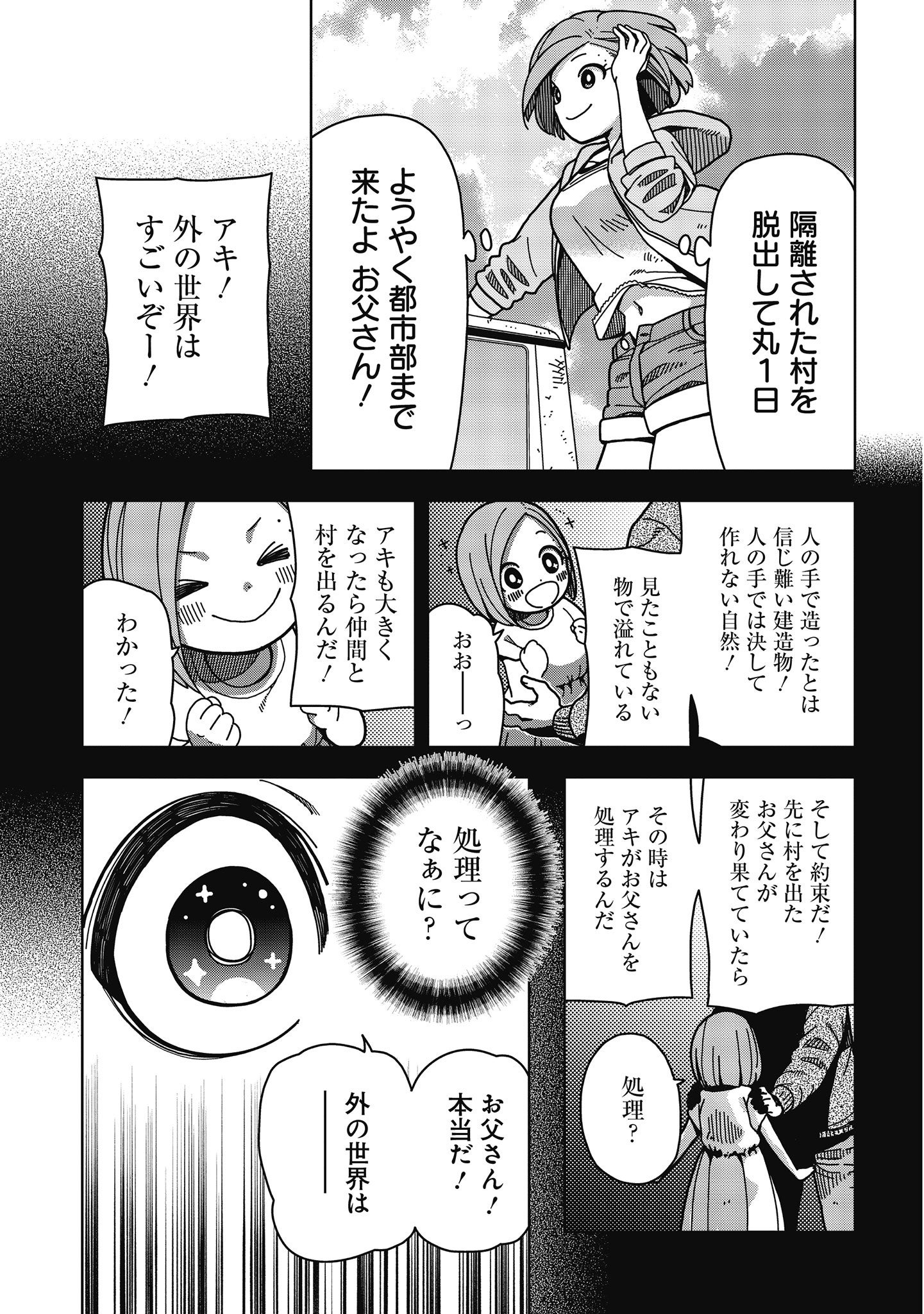 壊滅前の世界を記憶していないアキは父親をさがすため、仲の良いハル、ナツキと共に村を抜け出す。