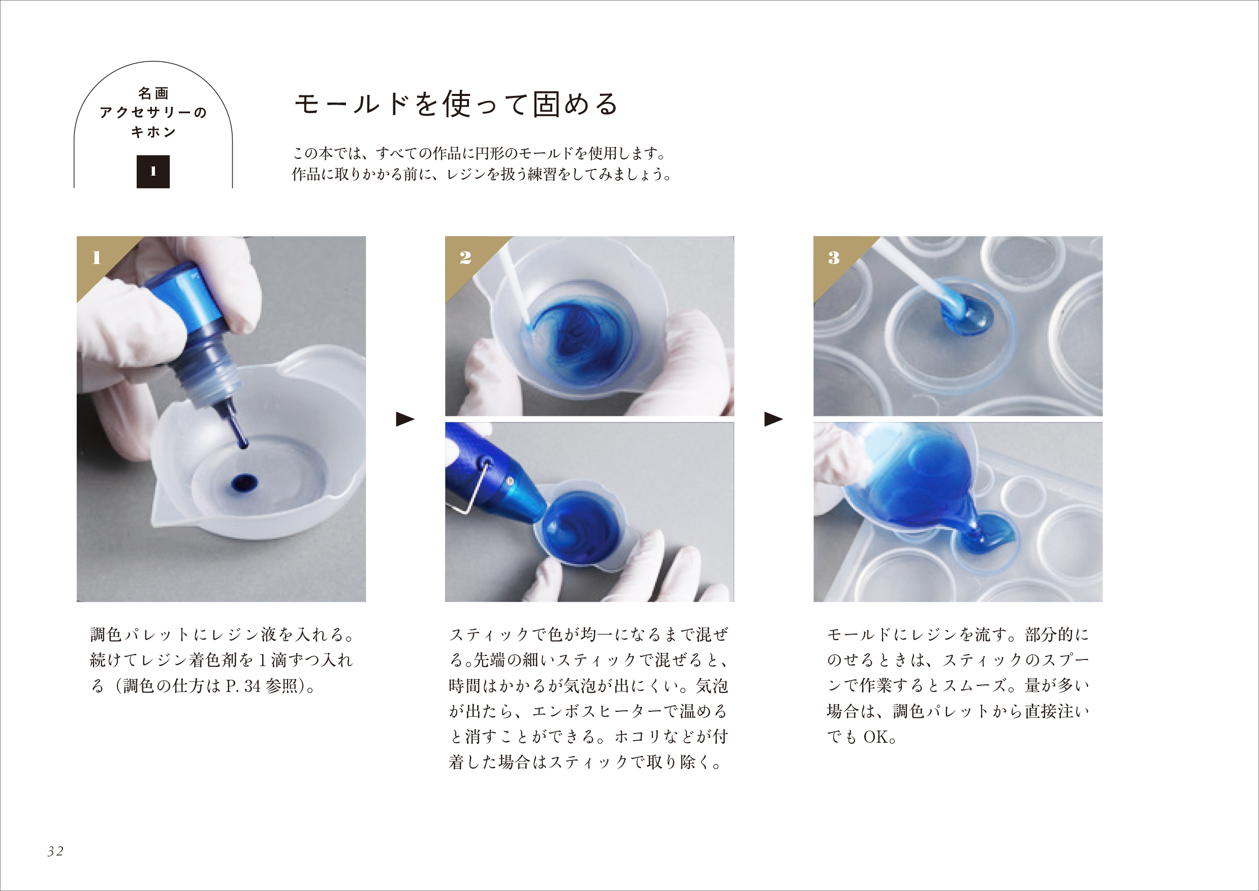 レジンが初めてという人でも大丈夫。基本の材料・道具から使い方まで、丁寧に解説しています。名画をモチーフにしたレジンのパーツは、一見難しそうに見えるかもしれませんが、豊富な写真で過程を丁寧にお見せして制作をアシスト。ひとつひとつの作り方をわかりやすく説明します。