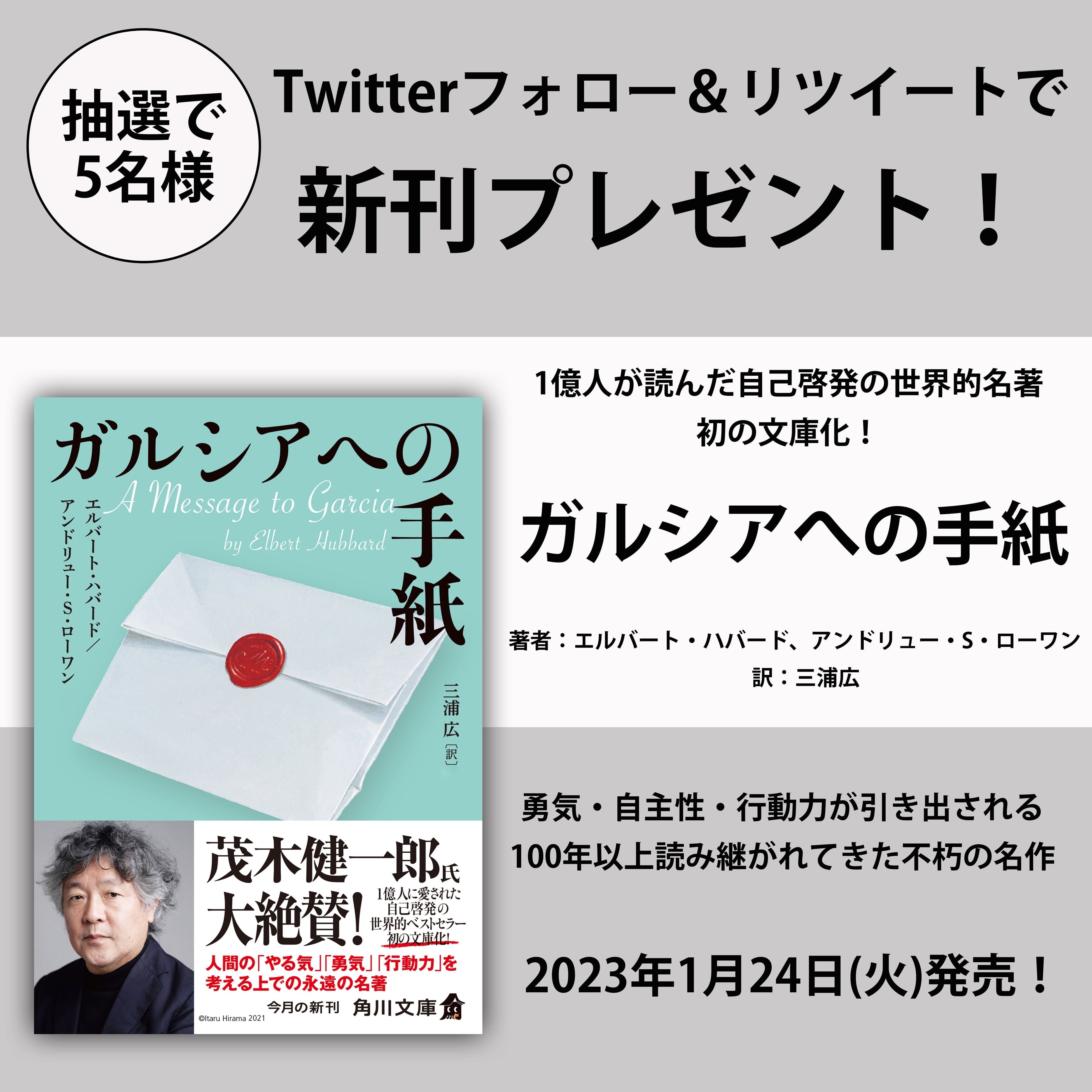 勇気・自主性・行動力が引き出される不朽の名作で、1億人が読んだ自己啓発の世界的名著を初めて文庫化した『ガルシアへの手紙』が2023年1月24日(火)に発売! これを記念して、1月17日(火)12:00よりTwitterで書籍のプレゼントキャンペーンを行います。