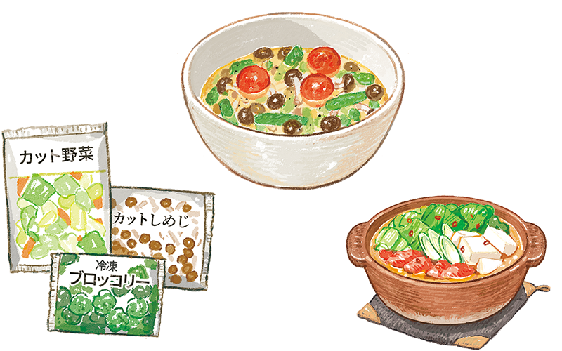◎洗わない、切らないでいい、カット野菜や冷凍野菜を活用