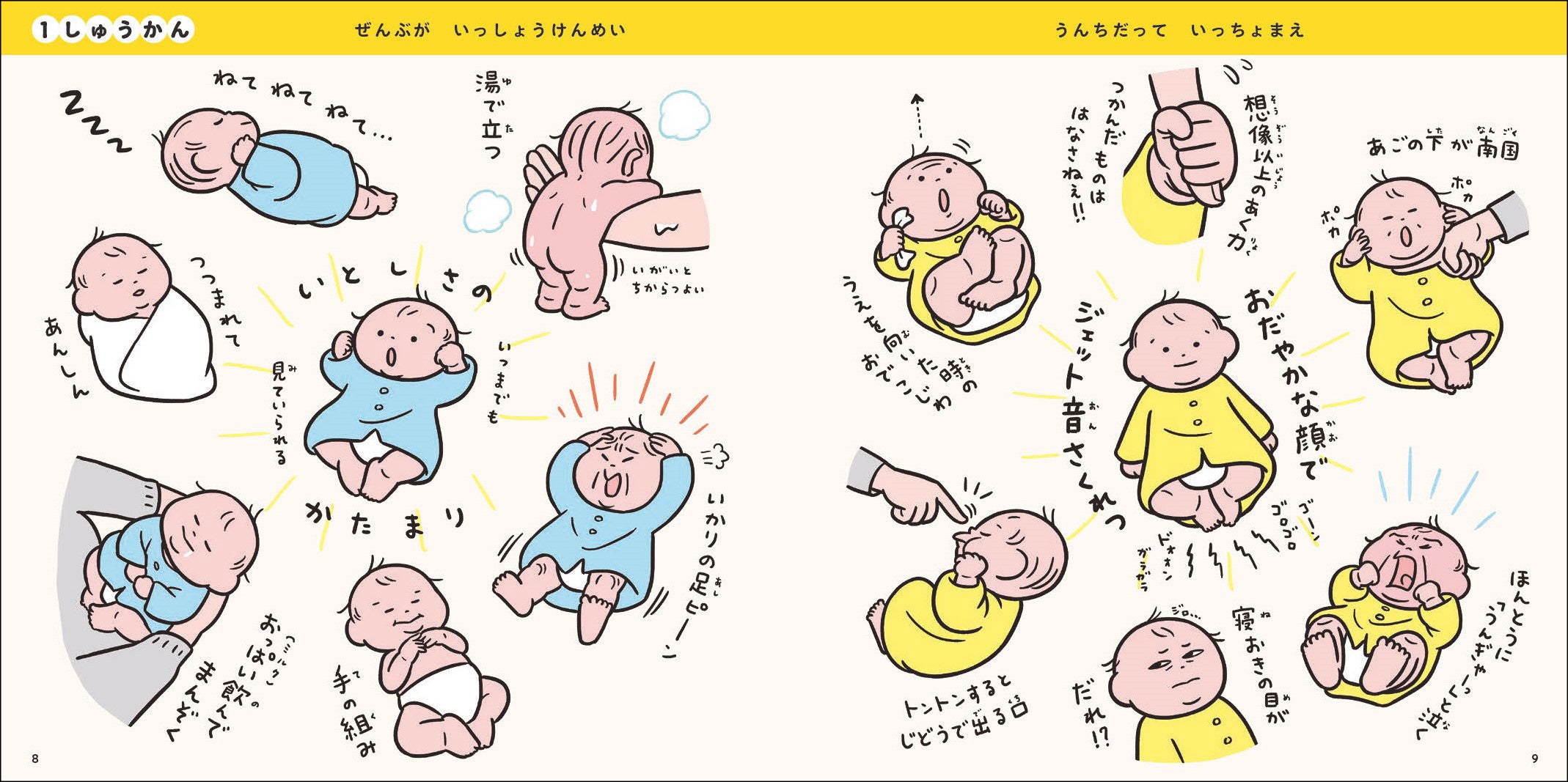 0歳から1歳半までの愛らしいしぐさや思わずニンマリするようなあるあるをぎゅっと凝縮して、大人もこどもも楽しめる一冊になりました。